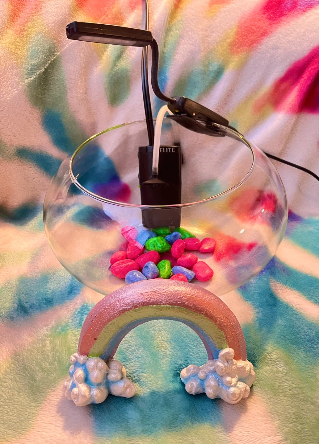 Includes: bubble bowl, Elite filter with bubbler, led light , nano air pump, betta food , decor / colourful rocks!