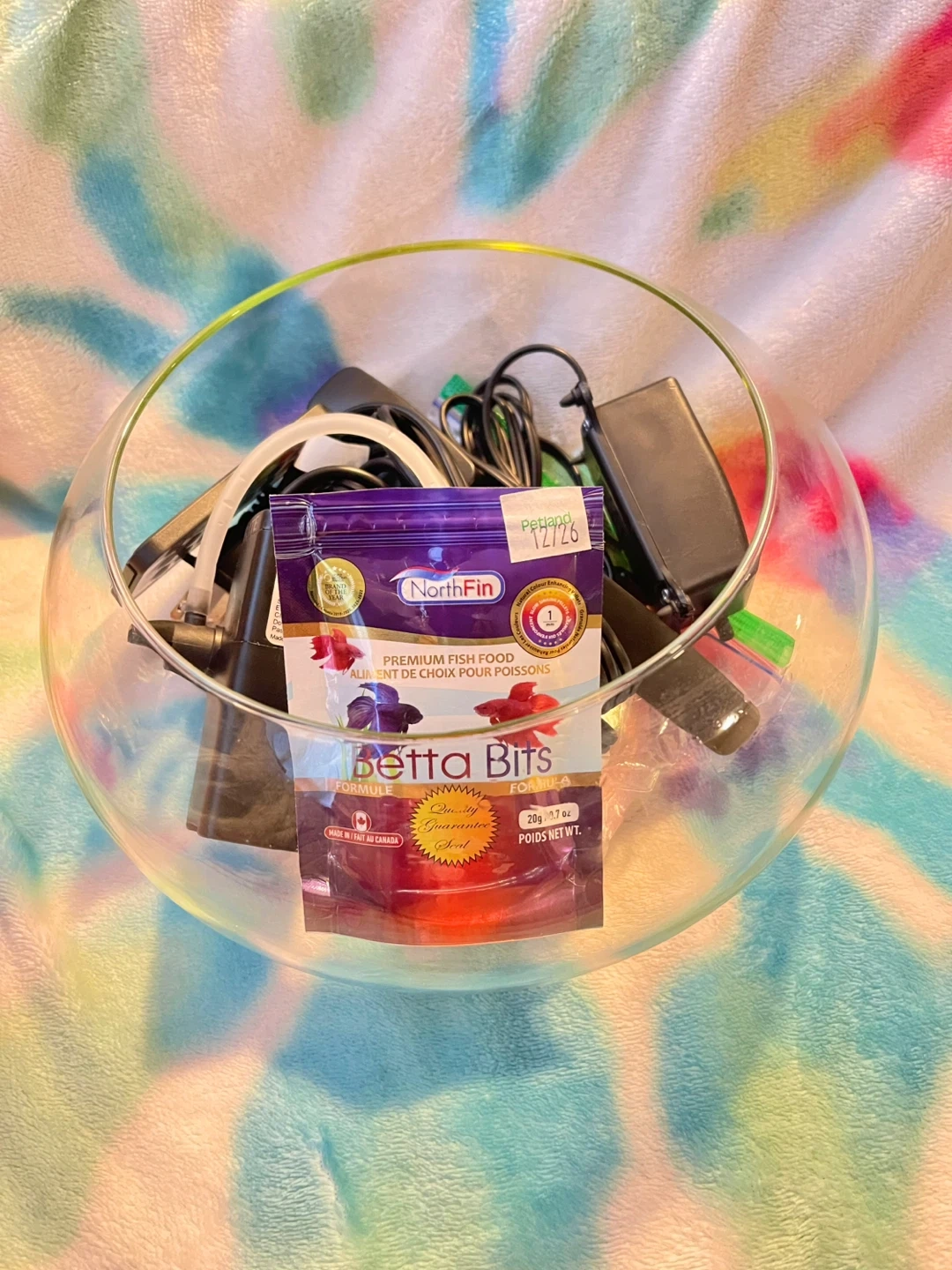 Includes: bubble bowl, Elite filter with bubbler, led light , nano air pump, betta food , decor / colourful rocks!