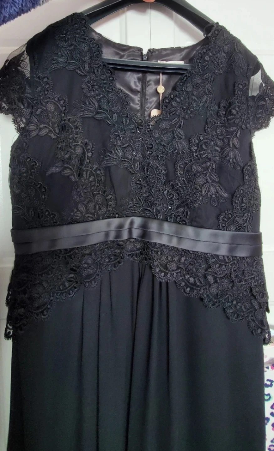 Featuring intricate lace trim on the bodice and sleeves.This dress would be lovely for a formal event or special occasion!