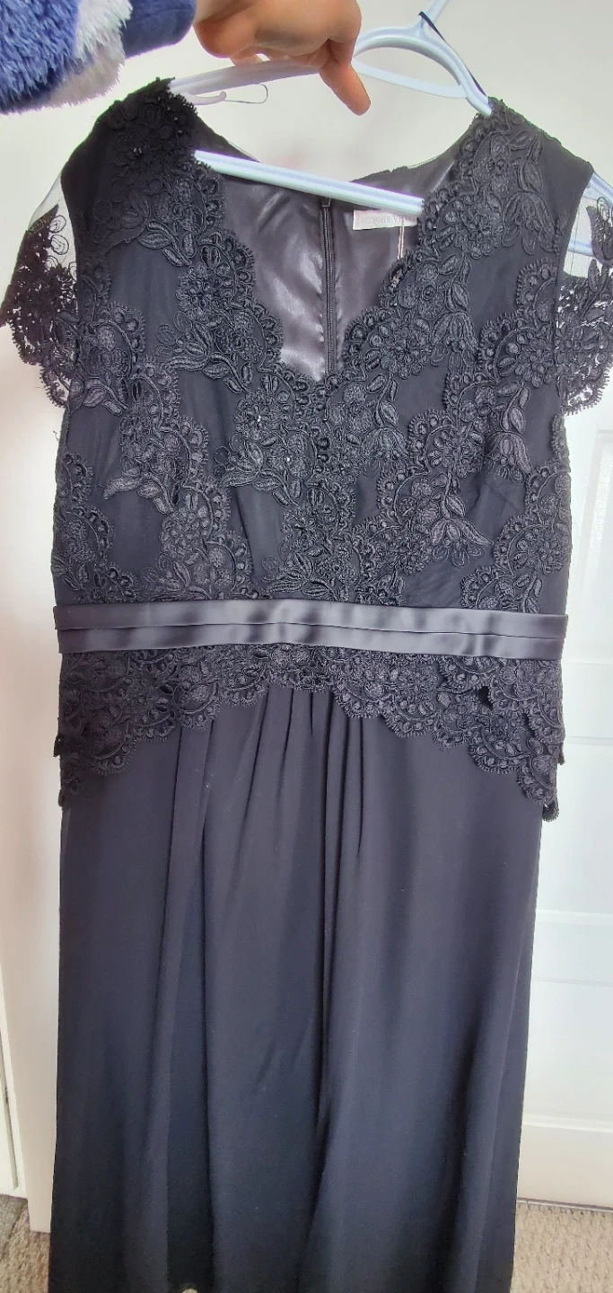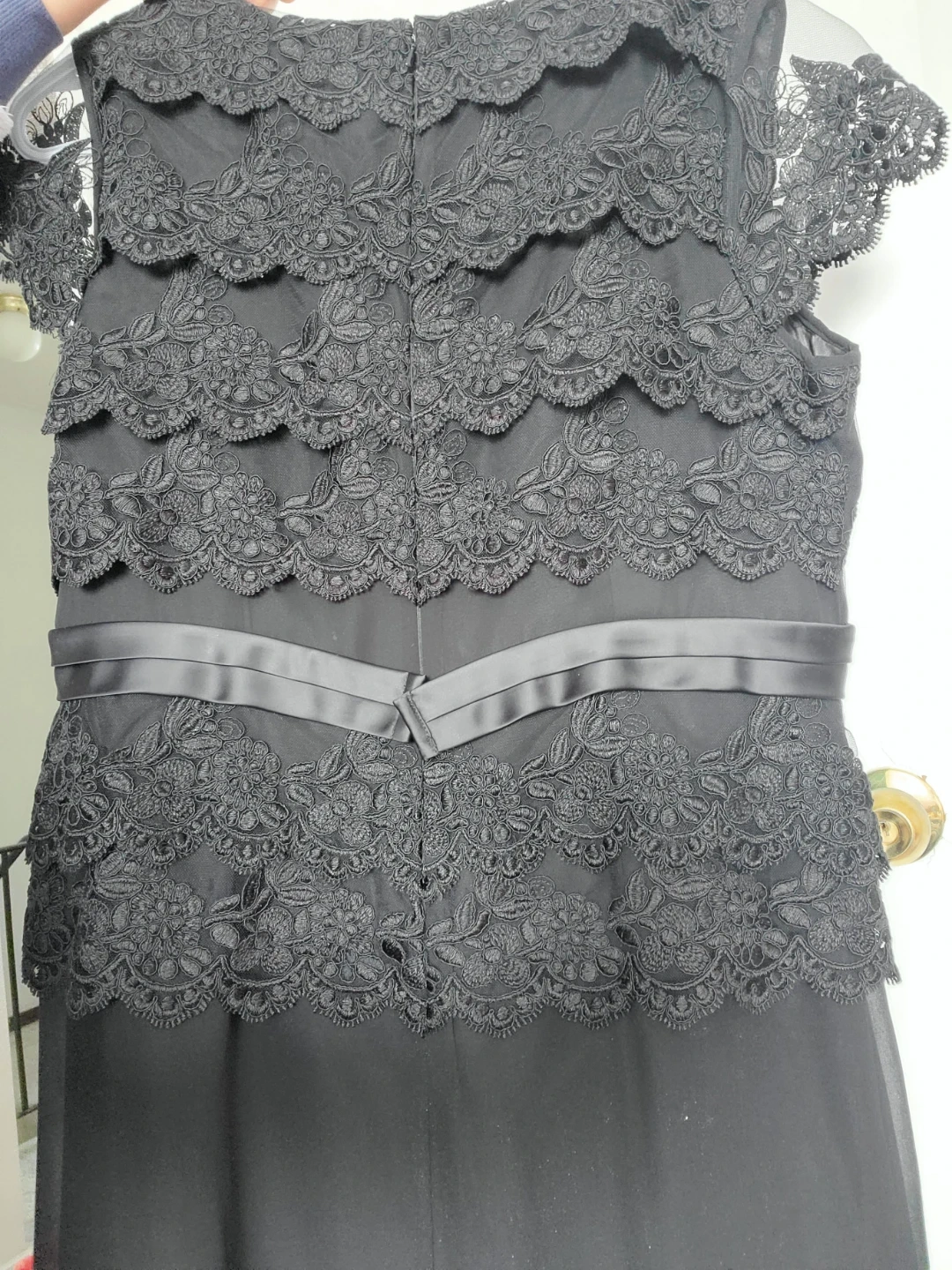 Featuring intricate lace trim on the bodice and sleeves.This dress would be lovely for a formal event or special occasion!