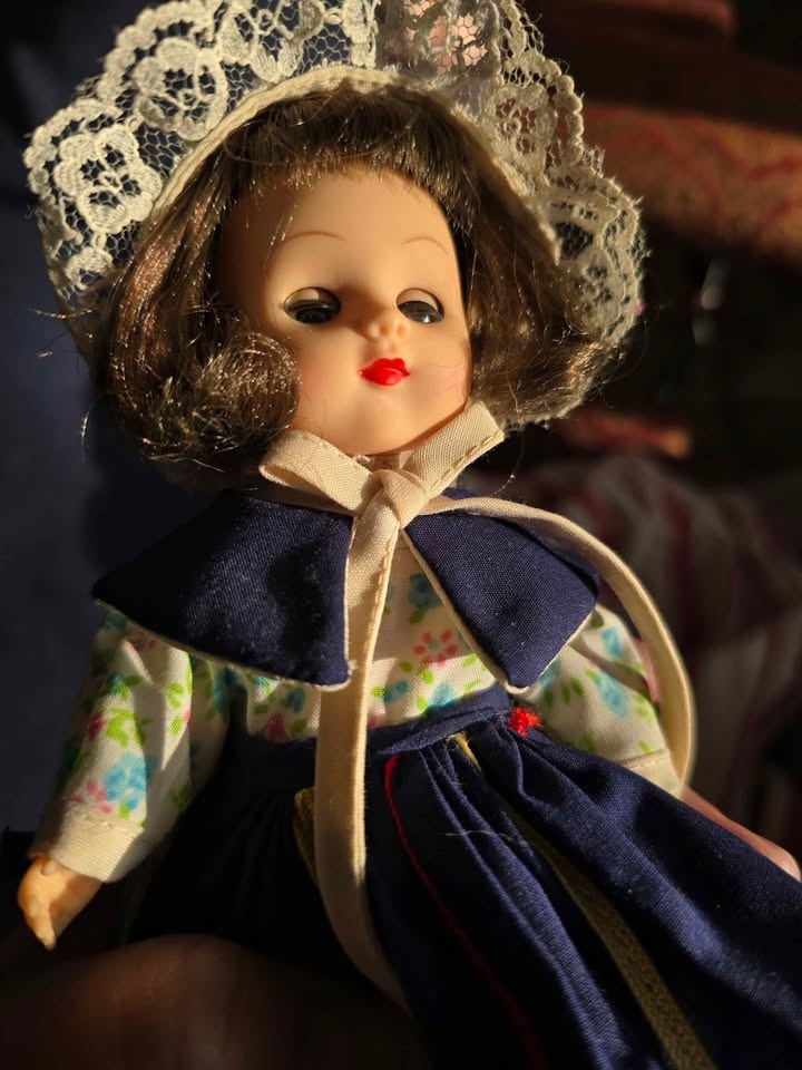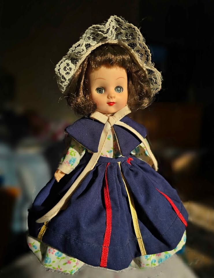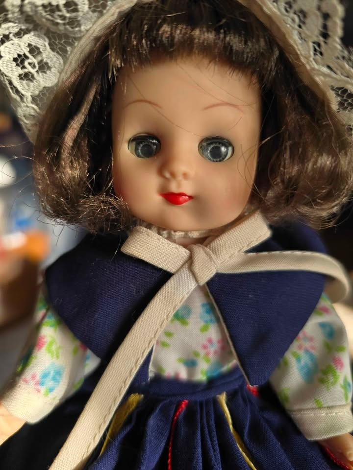 Vintage 1970s Ginny doll. Eyes open and close. Arms, head, and legs move. Clothes have never been removed, just sat on shelf. Includes black shoes. Dressed in European folk attire similar to Madame Alexander's Canada doll. Her adorable face needs a new home!