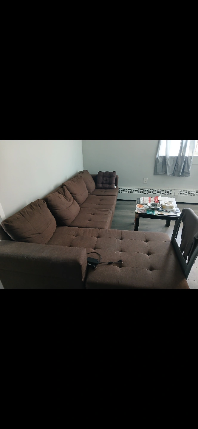 Selling a comfortable brown sectional sofa. It's in good condition and ready for a new home. Perfect for a living room or entertainment area!