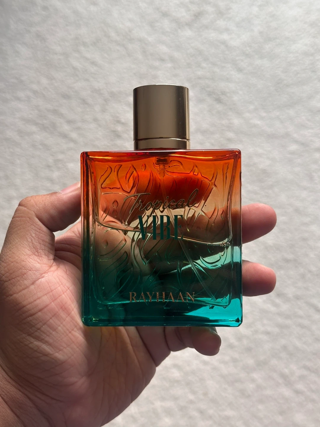 Selling a Rayhaan Tropical Vibe perfume bottle. It's a vibrant fragrance with a unique gradient design on the bottle