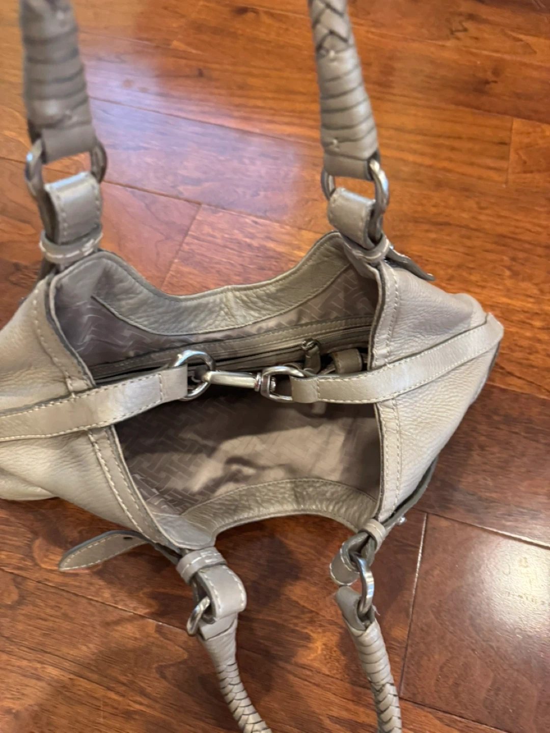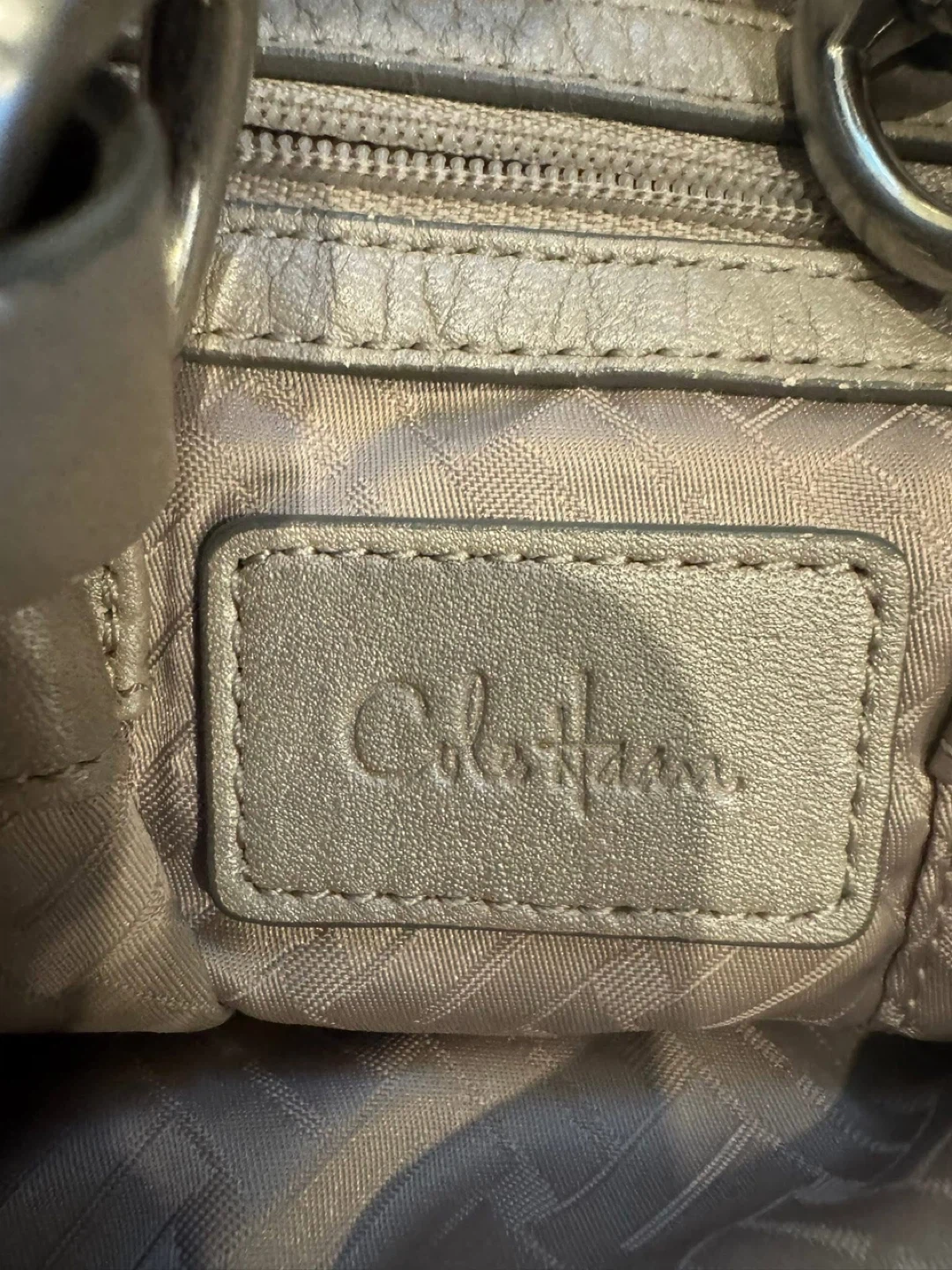 This is a stylish grey leather shoulder bag by Cole Haan. It features braided shoulder straps and silver-tone hardware. The interior lining is a contrasting fabric with the brand name subtly embossed. It's a versatile bag for everyday use.