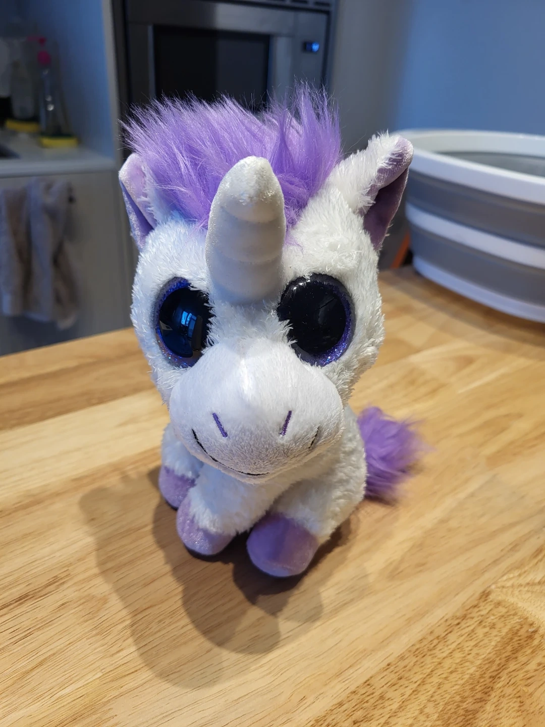 A fluffy white unicorn plush toy with a sparkling purple mane and tail. It has large, glittery blue eyes and purple hooves. This adorable stuffed animal is perfect for cuddling!