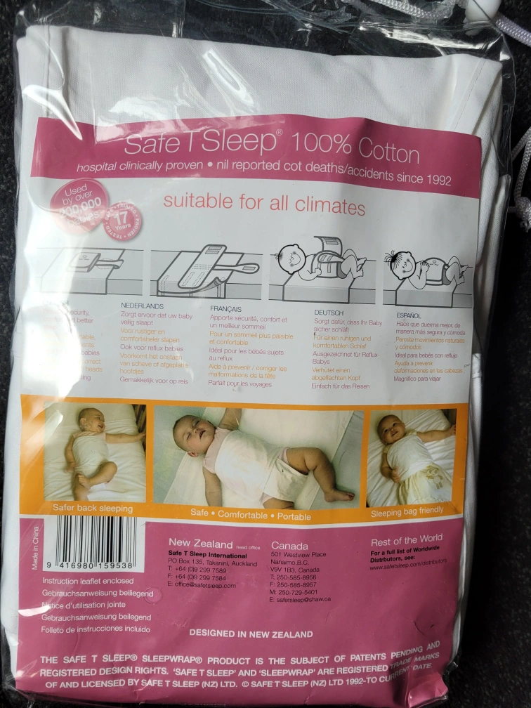 New improved Sleepwrap with Leg strap. Suitable for all climates. Hospital - clinically proven. 100% cotton. Classic model for use in moses basket, bassinet, crib, cot/crib.