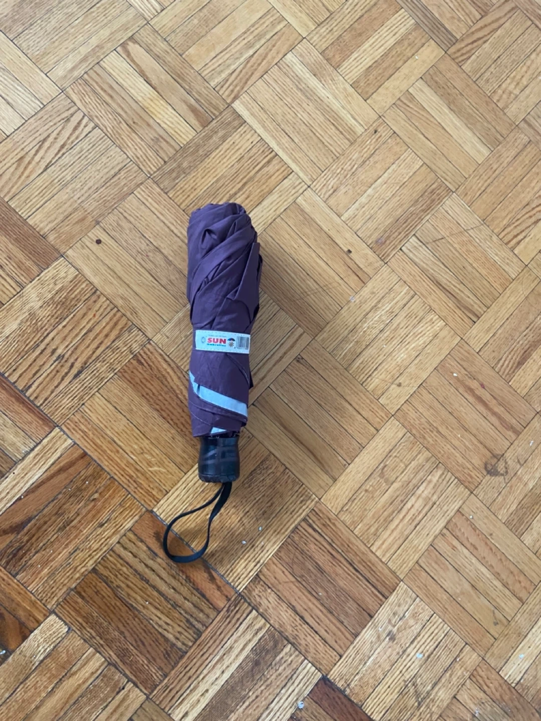 A compact foldable umbrella in a deep purple colour. It's designed for portability and convenience. Includes a wrist strap for easy carrying.