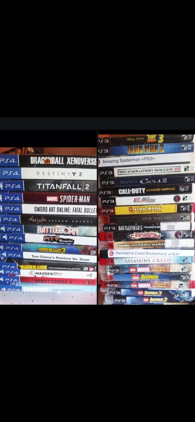 PS3 or PS4 video games. Includes titles like Call of Duty, Assassin's Creed, Star Wars, and Marvel. Games are for PlayStation consoles.