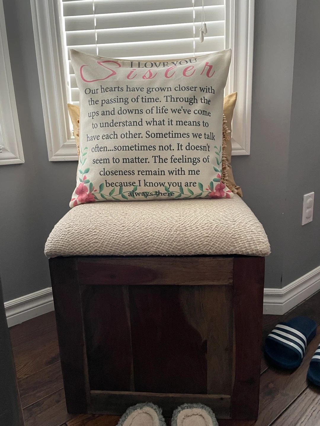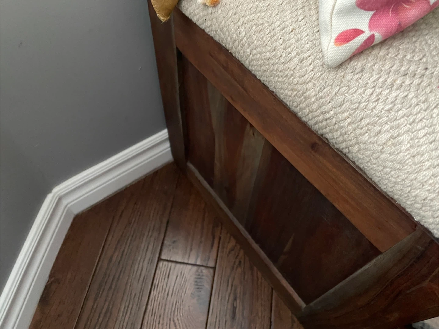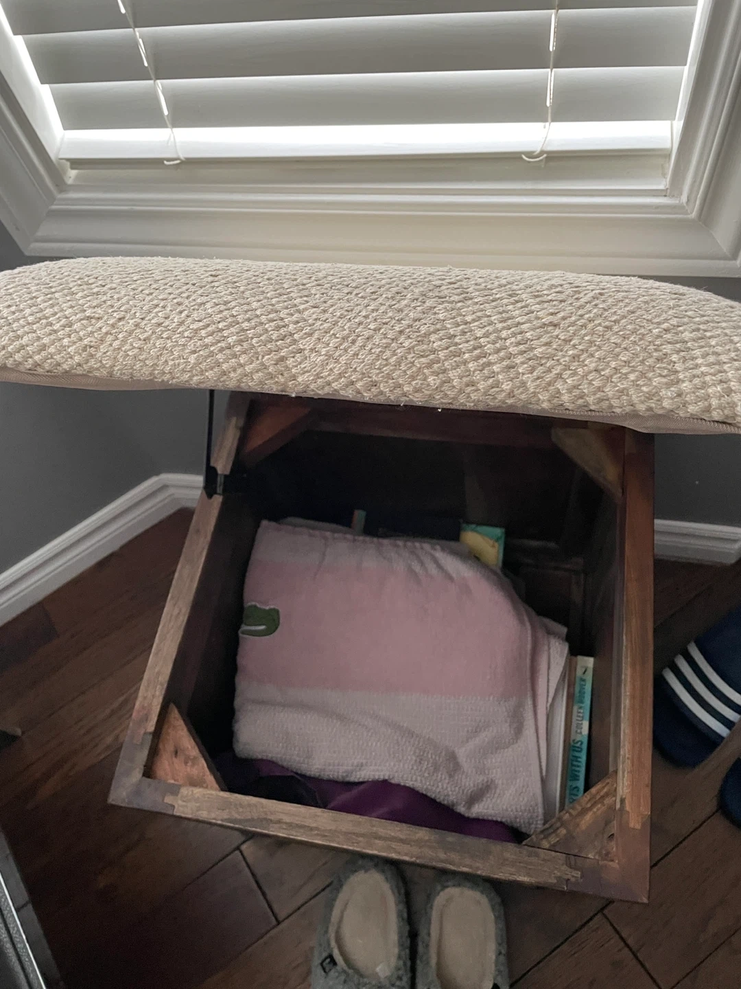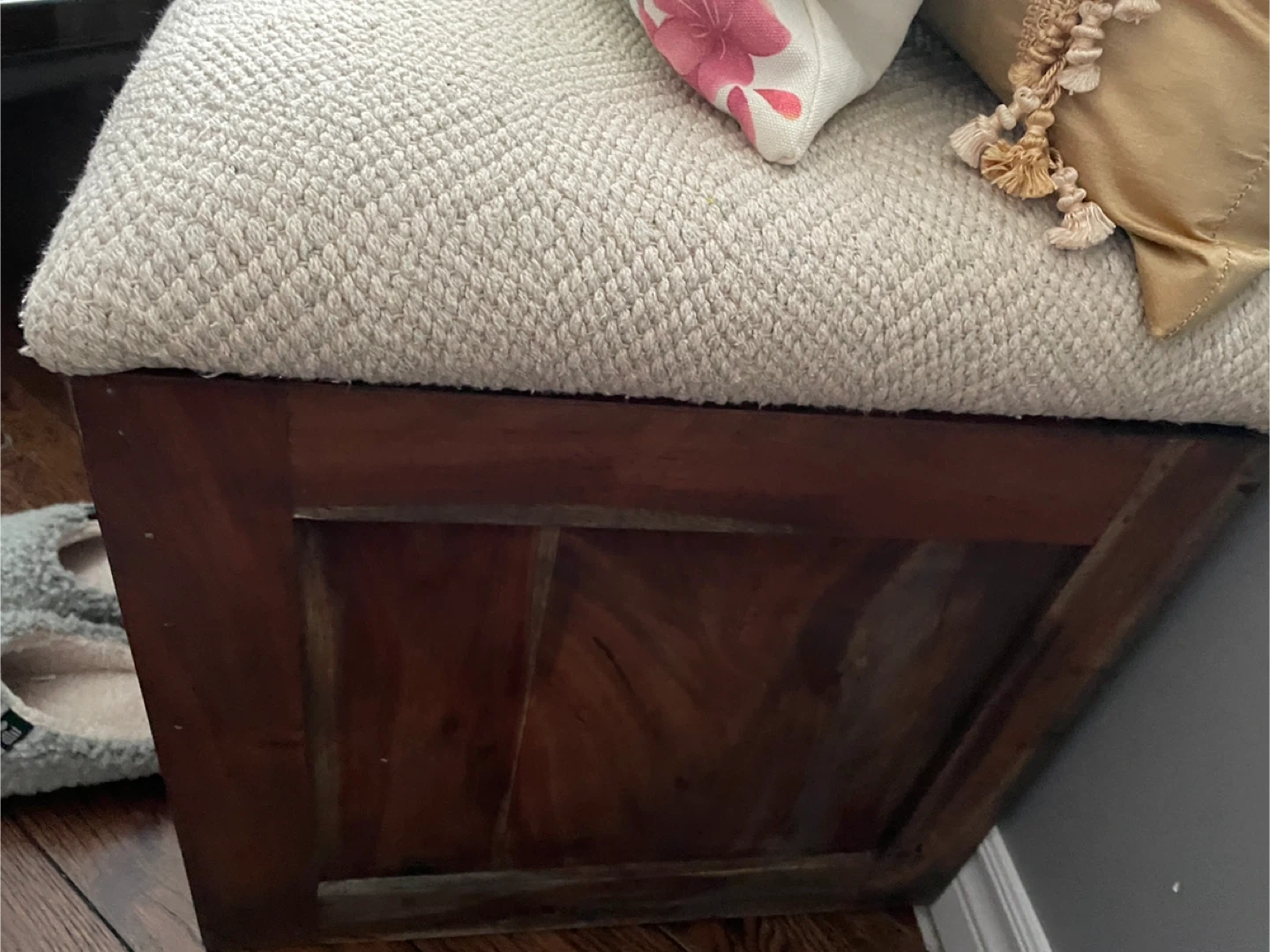 A rustic wooden ottoman with a cushioned seat. It opens up for storage inside. Great for entryways or at the foot of a bed.