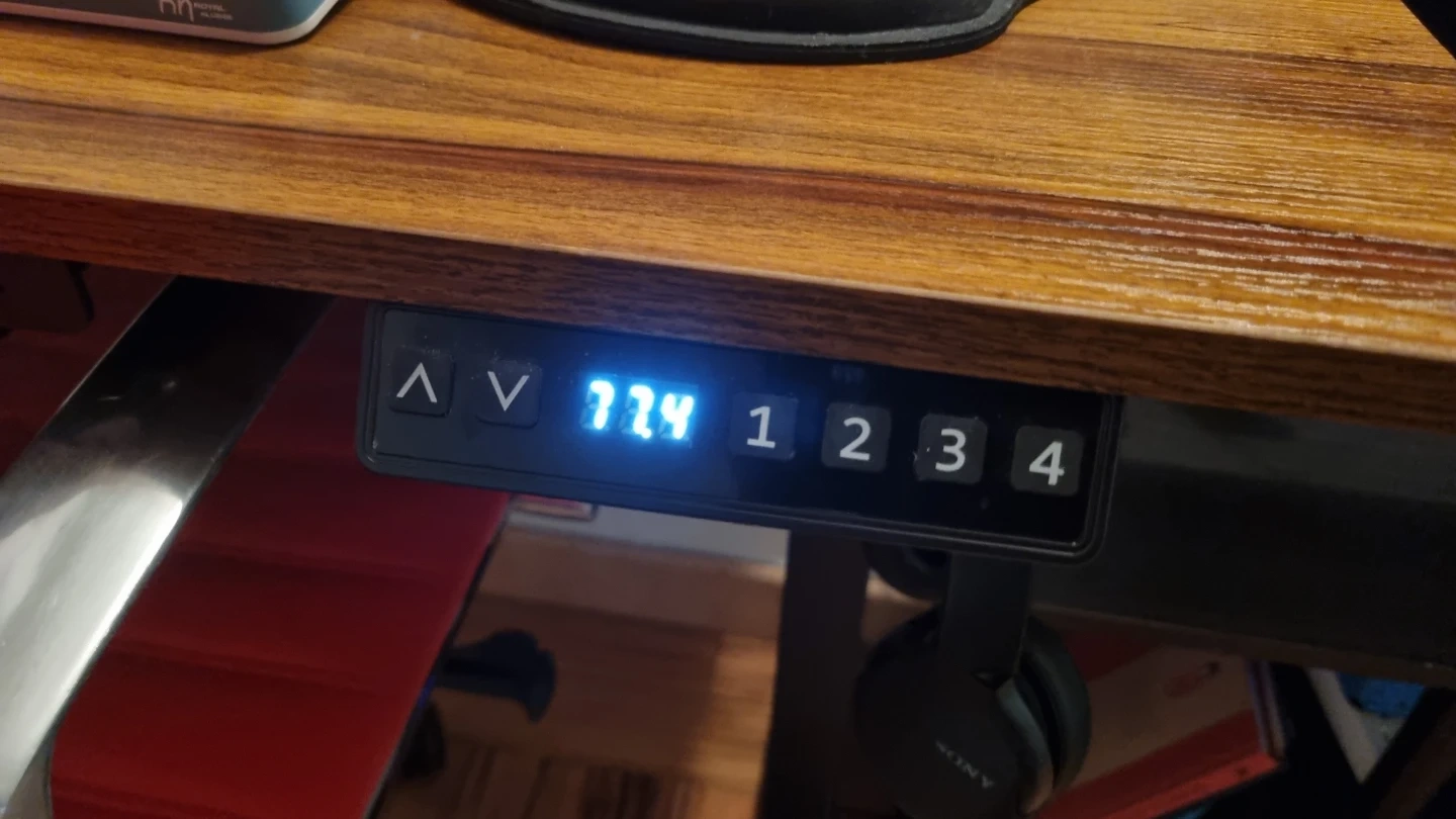 Adjustable height electric standing desk 100x60cm with a beautiful walnut wood grain finish. Control panel with up to 4 presets. Used for less than a year.