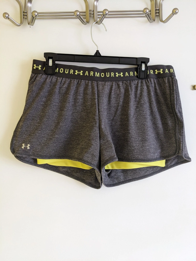 Selling a pair of Under Armour HeatGear athletic shorts in size large. They have the dual layer to help with thigh rub. They're in great condition and perfect for workouts or everyday wear. The shorts feature a comfortable fit and the signature HeatGear technology to keep you cool and dry!