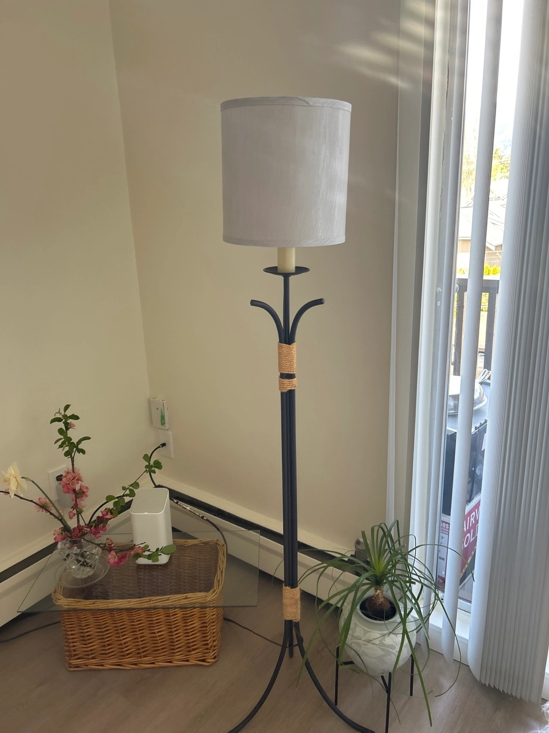 Tall black metal floor lamp. Natural rope accents. Light grey fabric shade. Elegant design. Great for living room or bedroom.