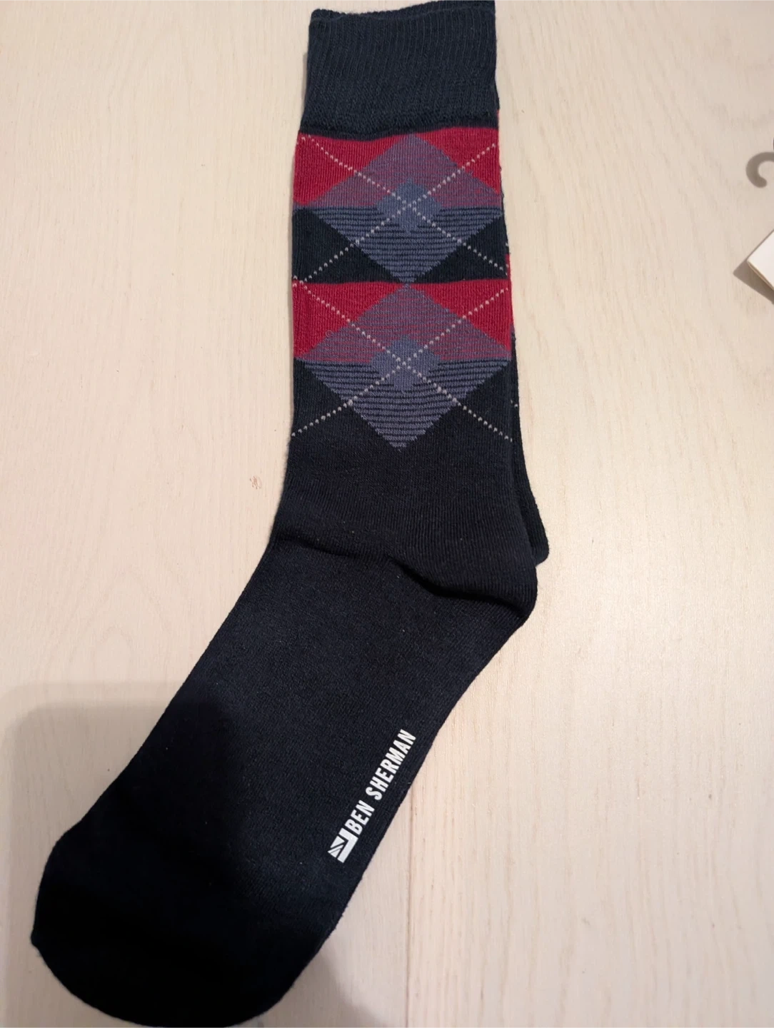 Here's a pair of Ben Sherman socks! They're black with a classic argyle pattern in red, grey, and black. These socks are sure to add a touch of style to any outfit