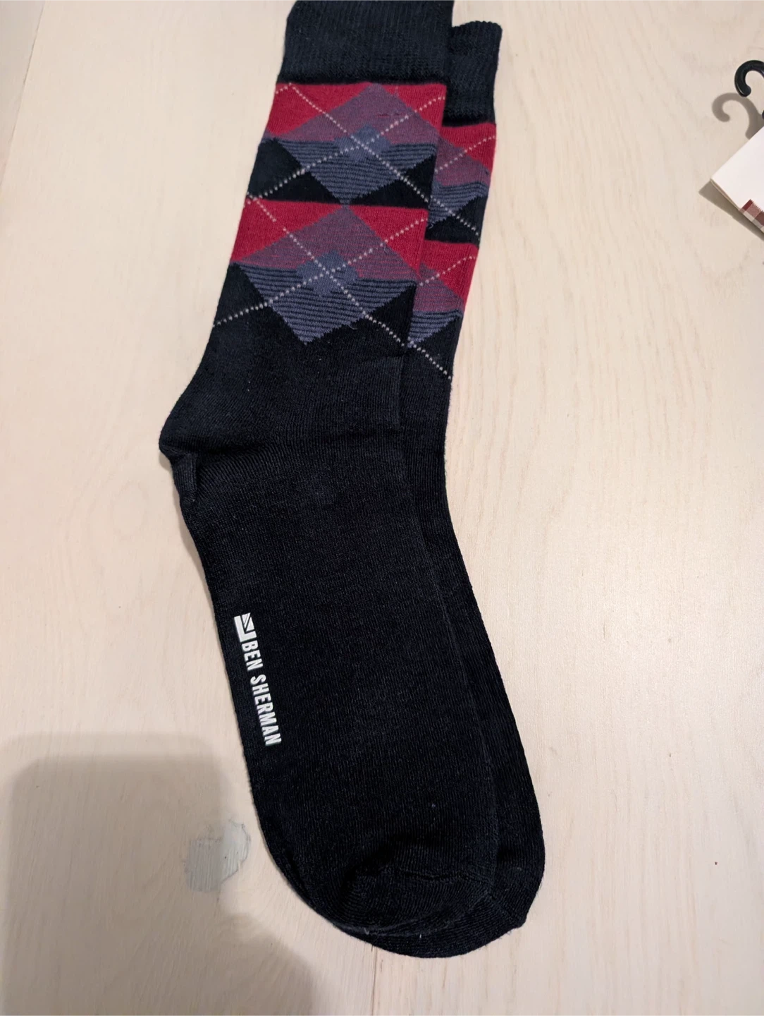 Here's a pair of Ben Sherman socks! They're black with a classic argyle pattern in red, grey, and black. These socks are sure to add a touch of style to any outfit