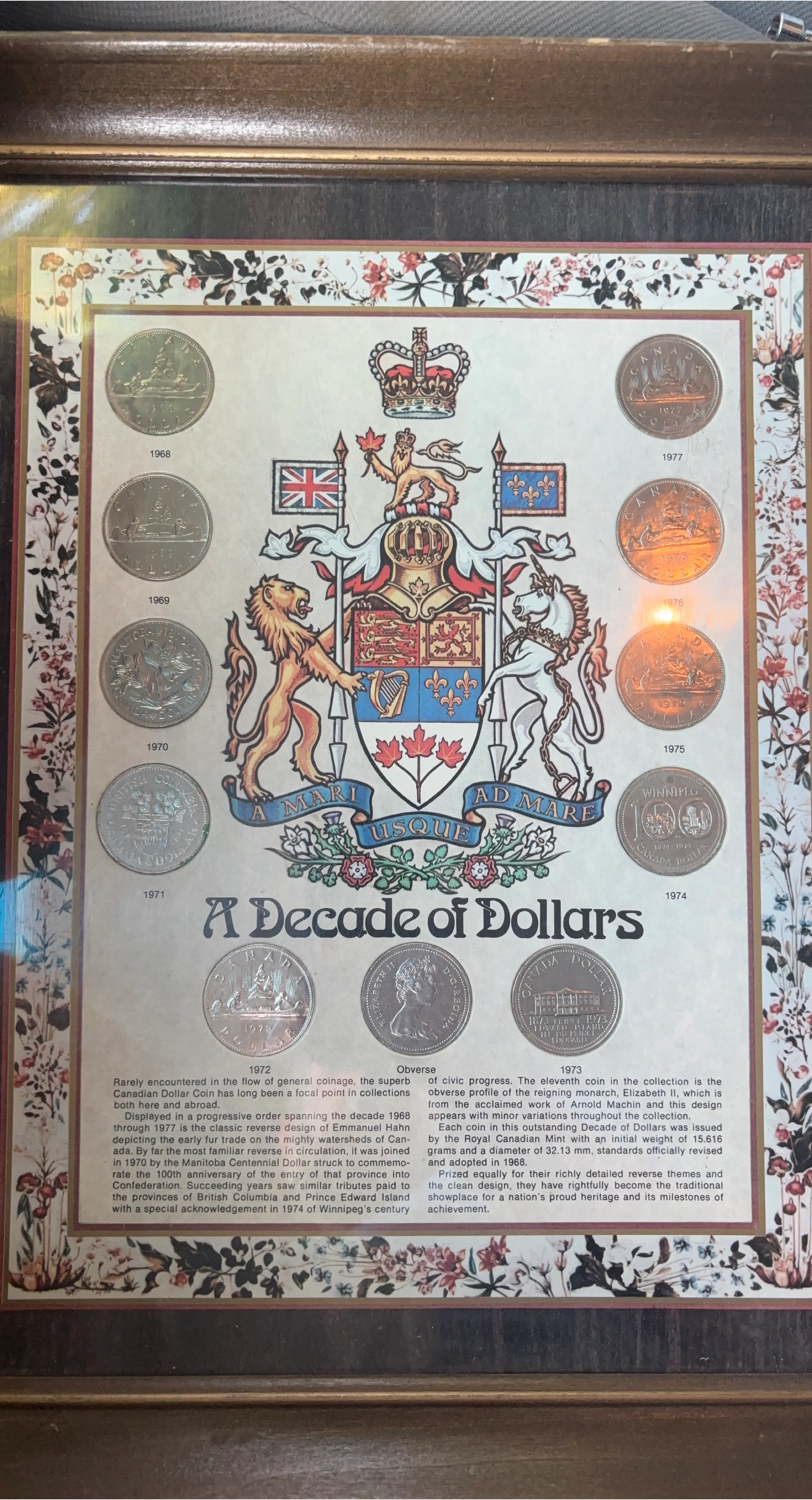 Here's a framed collection of Canadian dollar coins, representing the decade from 1968 to 1977. It showcases the classic reverse design by Emmanuel Hahn, depicting Canada's early fur trade. The collection also includes coins commemorating Manitoba's centennial in 1970 and tributes to other provinces. Each coin was issued by the Royal Canadian Mint.