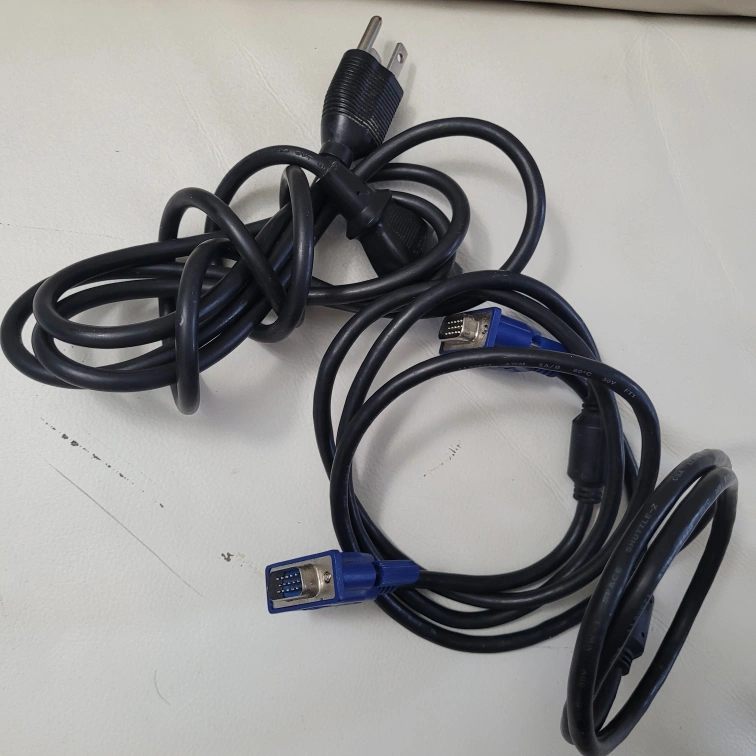 Black monitor, includes power cable and VGA cable. HDMI input.