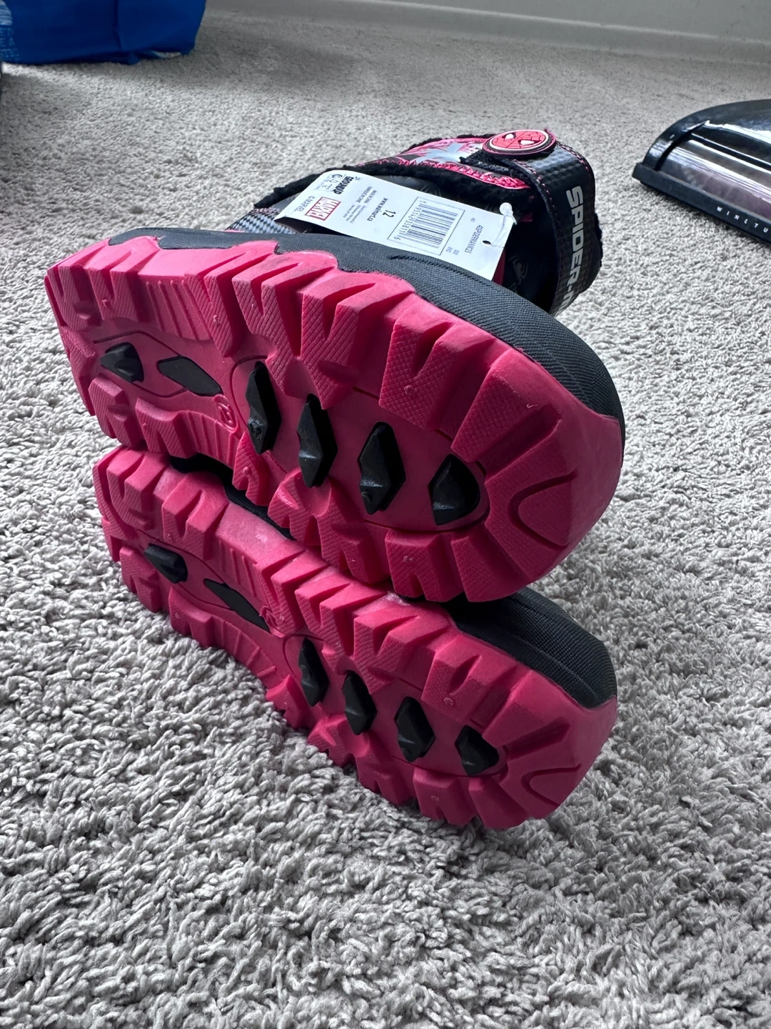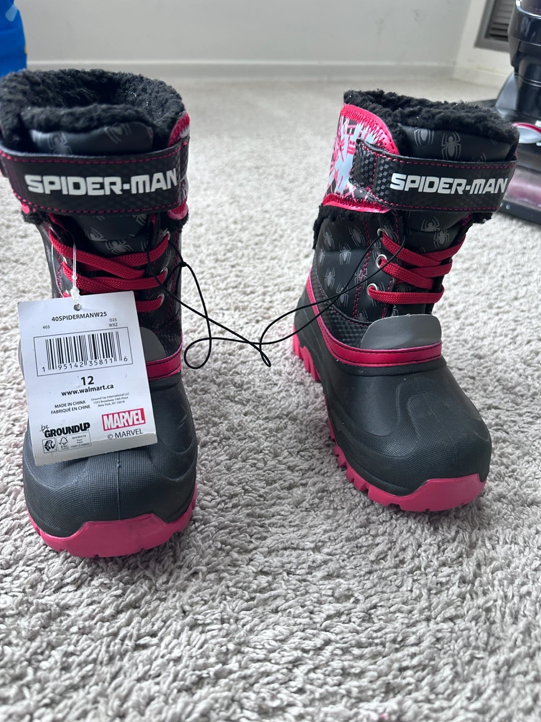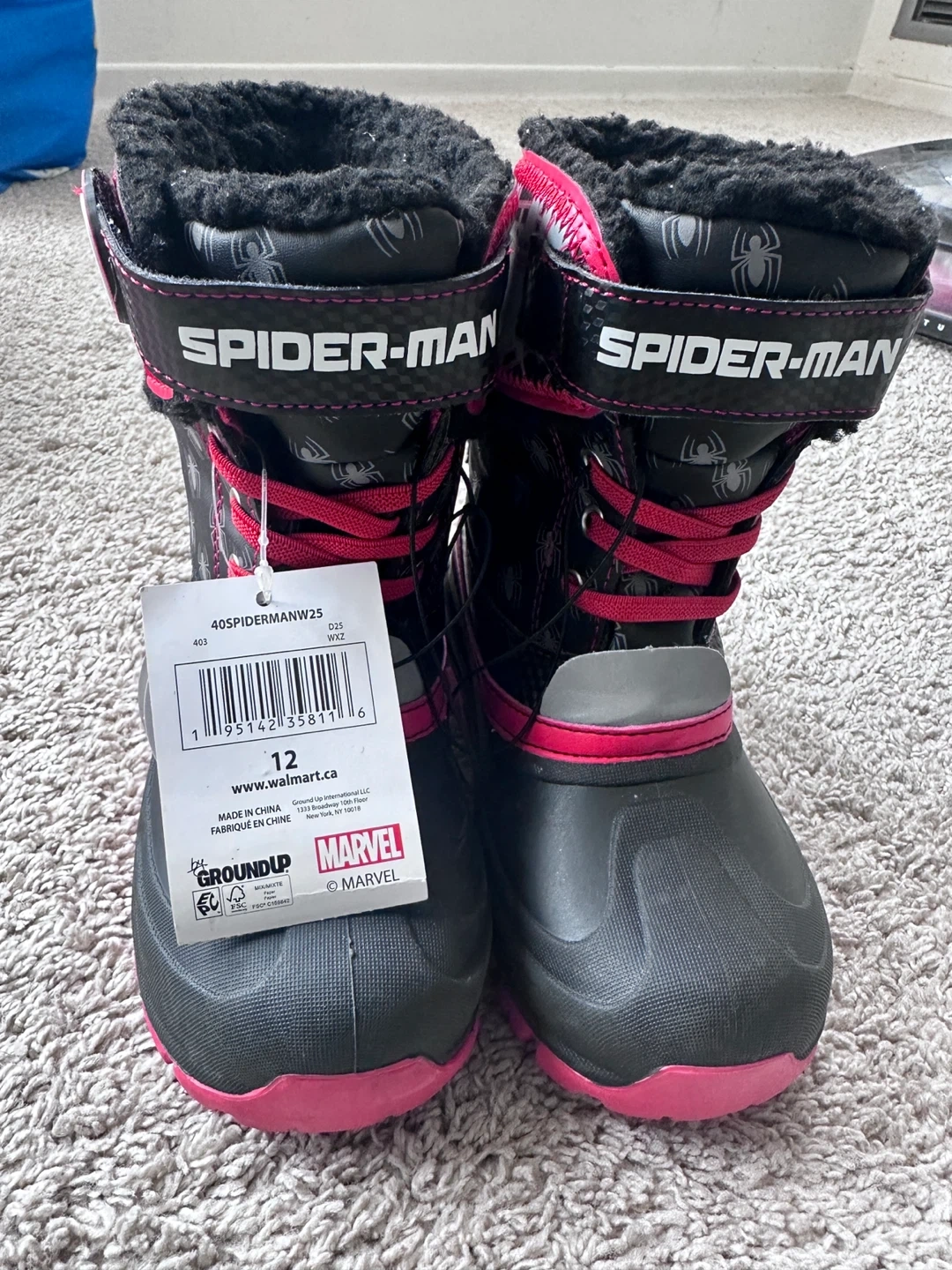 These black and pink Spider-Man winter boots are designed for kids. They're insulated and feature hook-and-loop straps for easy on and off. Durable rubber soles offer good traction for playing in the snow. Perfect for keeping little feet warm and dry during colder months!
