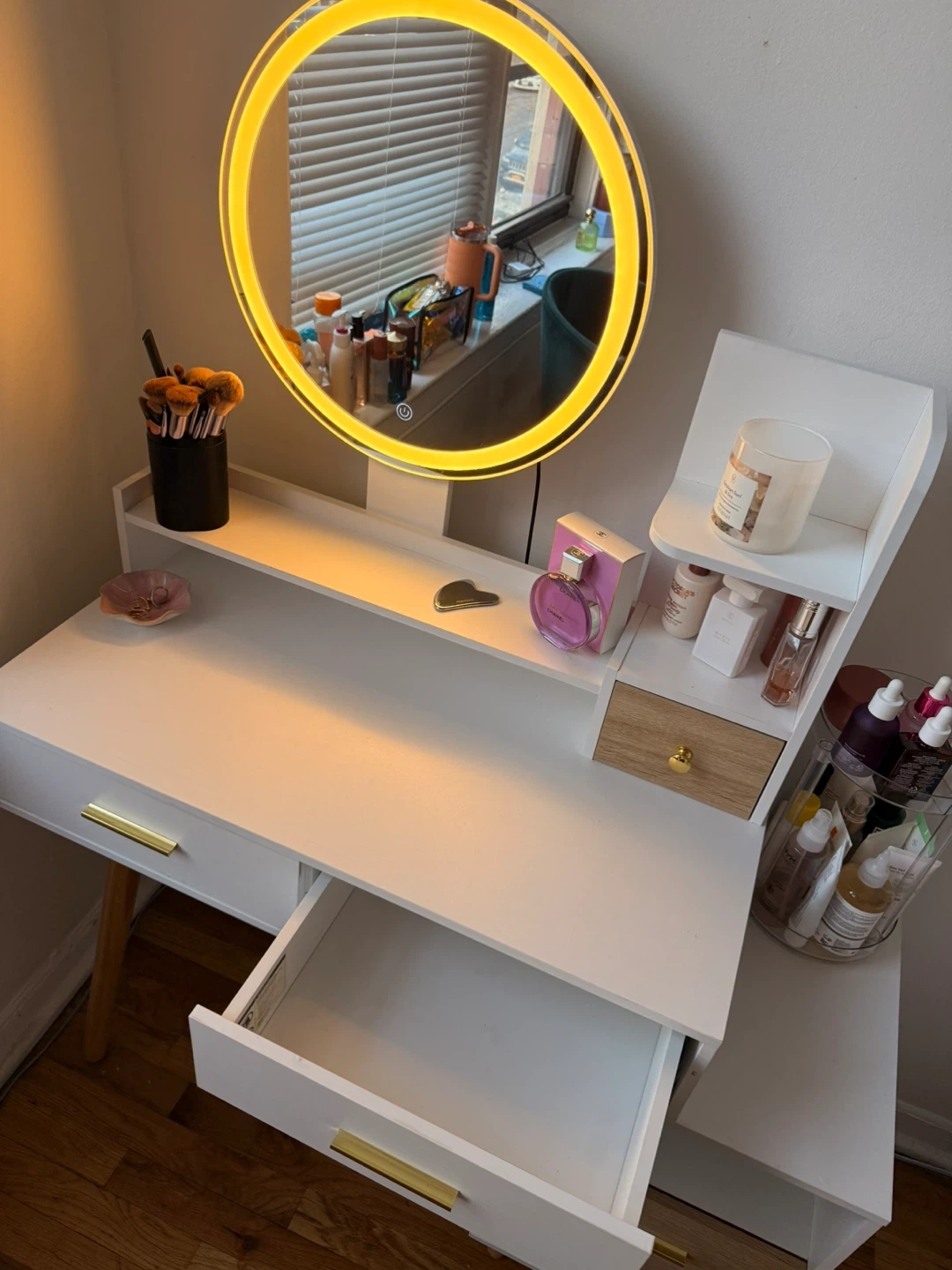 Súper cute vanity mirror with LED adjustable lights. Already assembled.