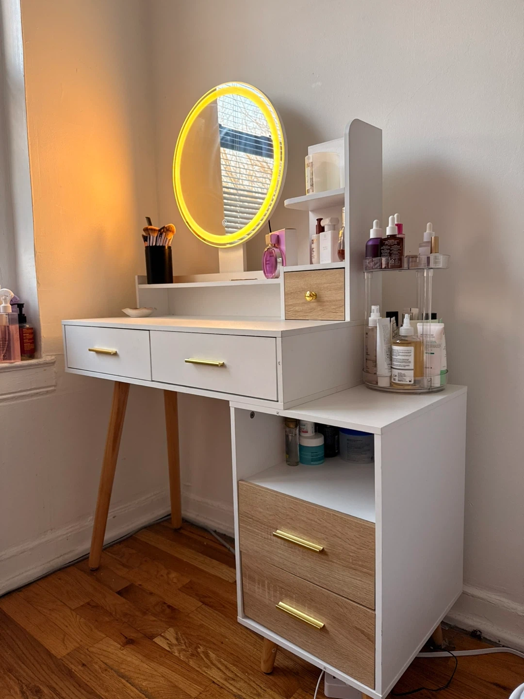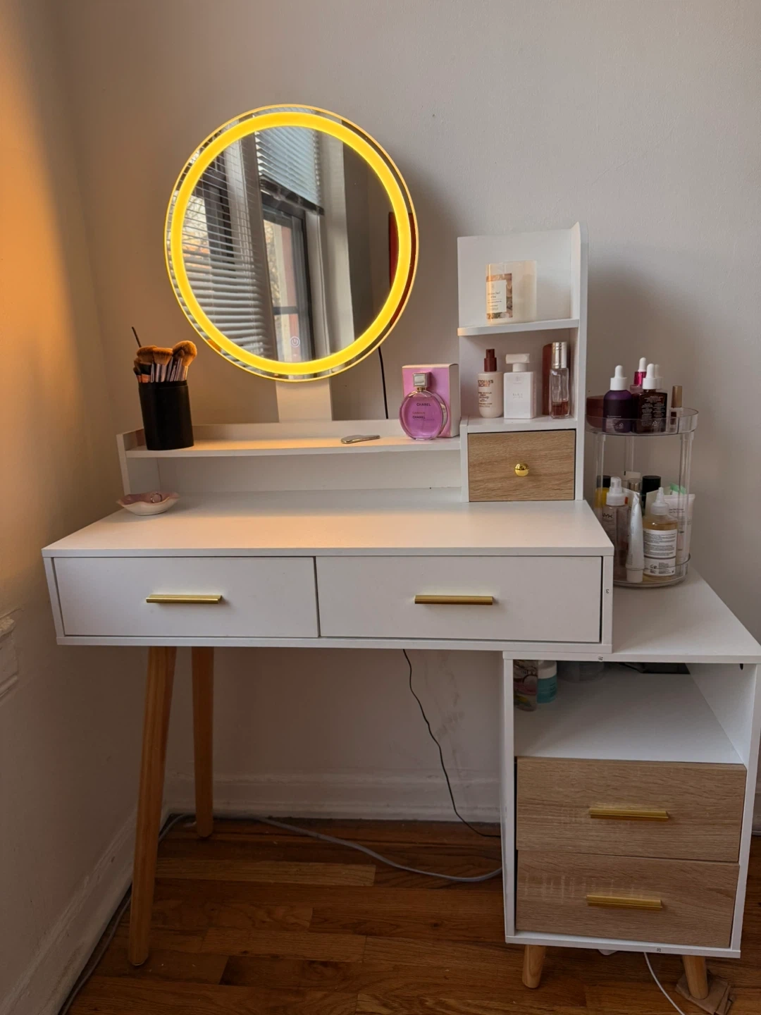 Súper cute vanity mirror with LED adjustable lights. Already assembled.