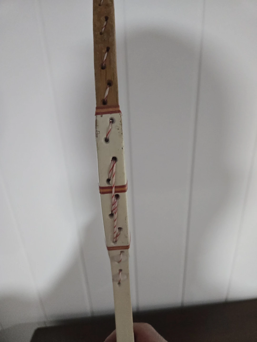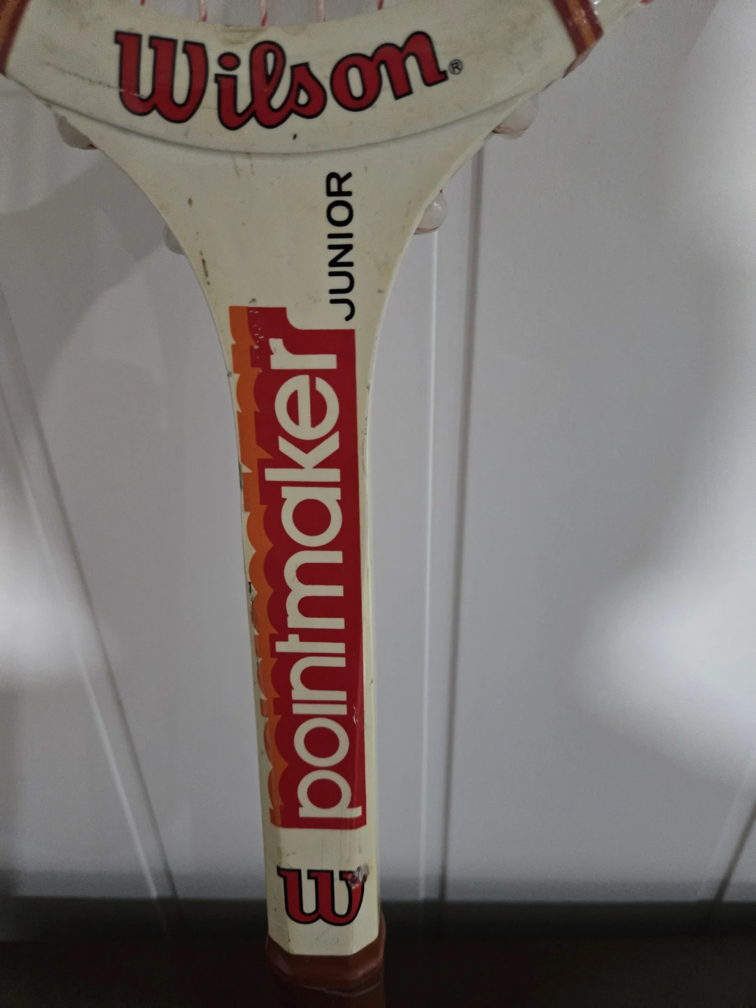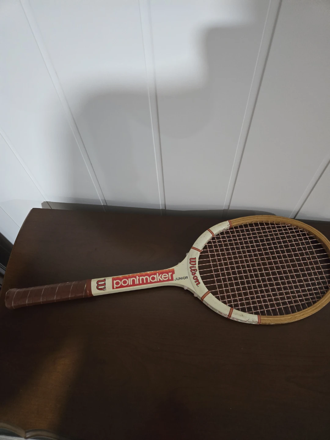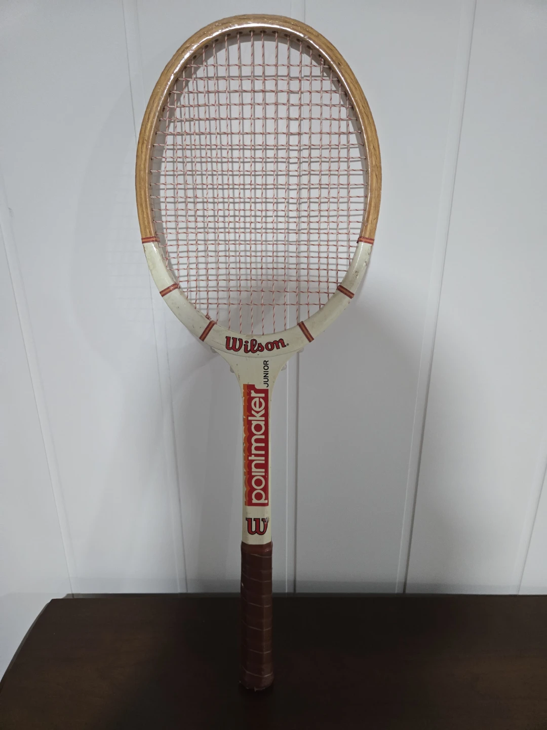 This is a Wilson Pointmaker Junior tennis racquet. It's made of wood with a grip handle. Perfect for aspiring young tennis players getting started with the sport!