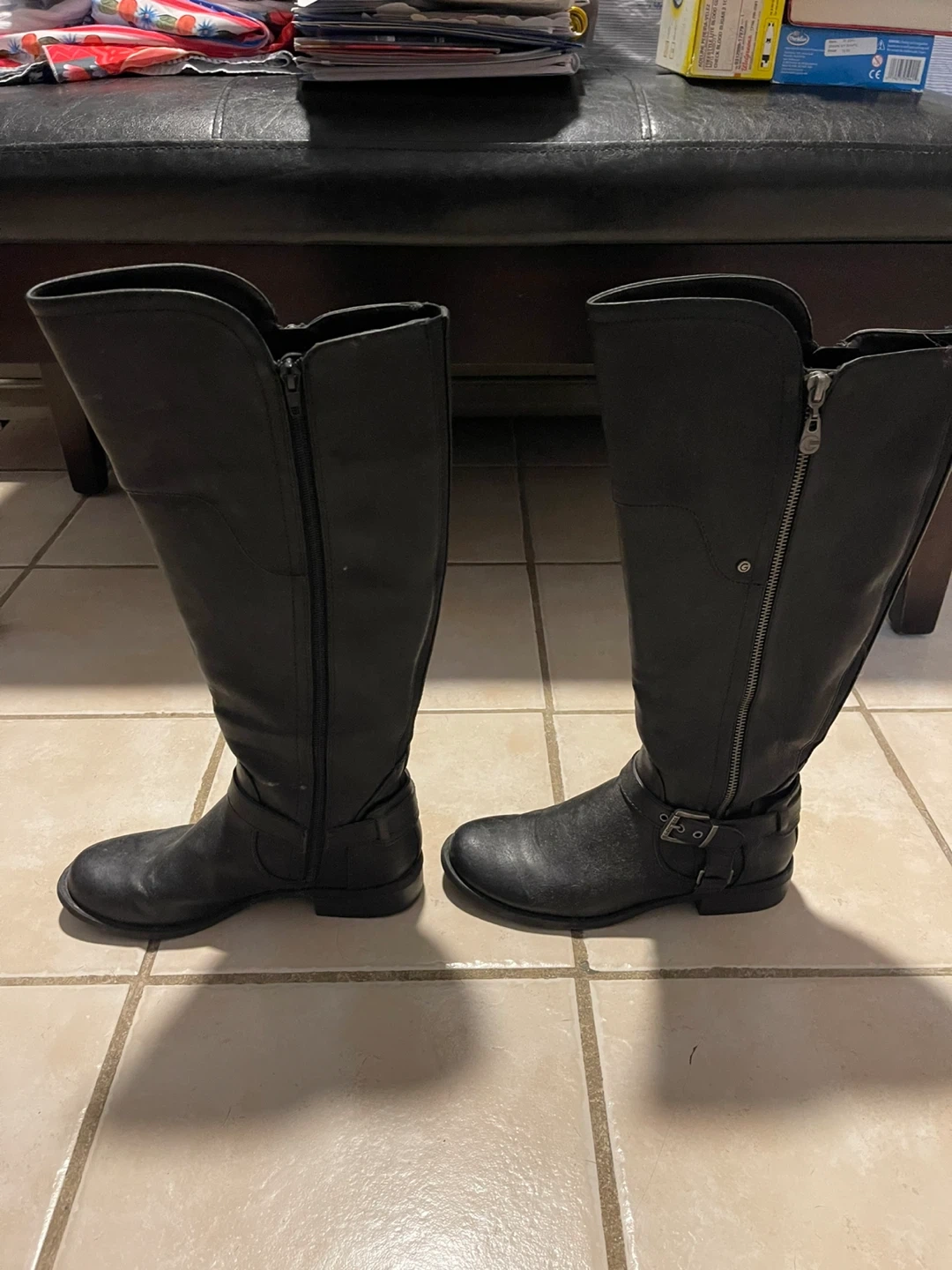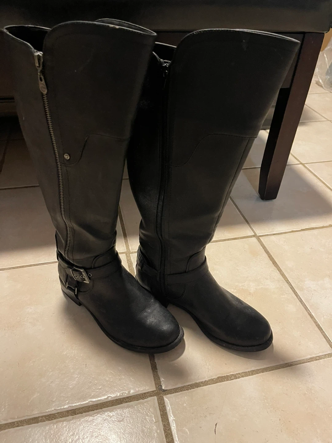 These black knee-high boots are made of faux leather and feature a side zipper for easy on and off. A buckle accent adds a stylish touch. These boots are perfect for completing a fall or winter outfit!