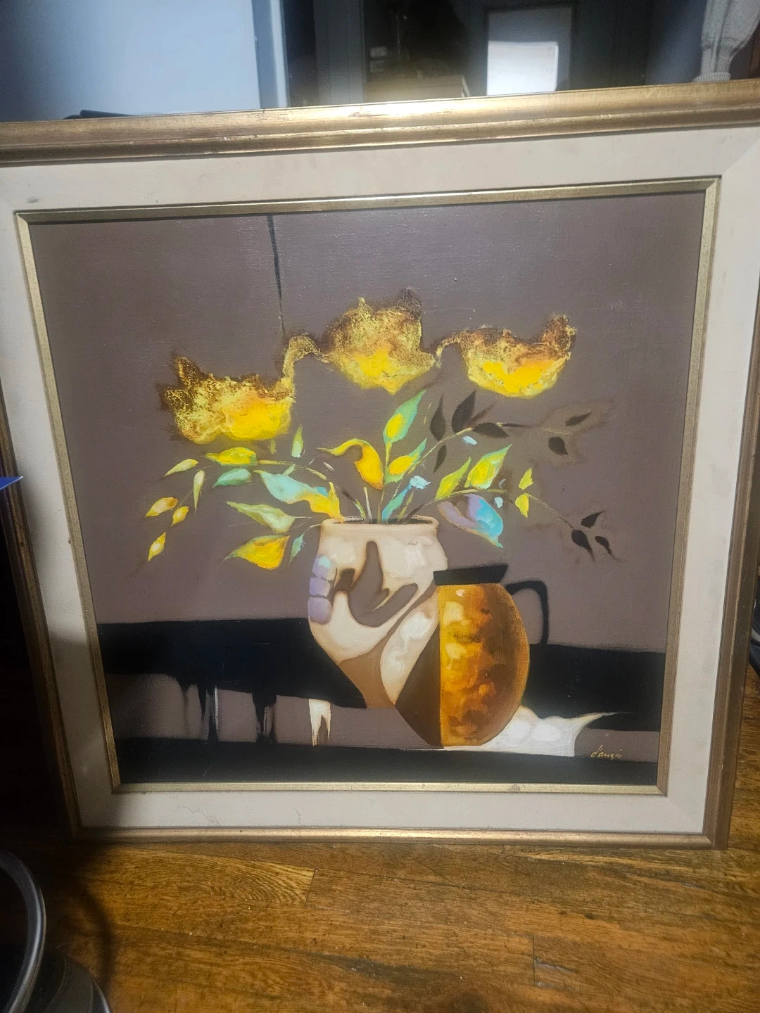 This is an original oil painting depicting flowers in a beige vase. It's framed and ready to hang. The artwork is signed by the artist and was custom framed in Culver City, Calif. It's a beautiful piece that would add color to any room! SIGNED. d.anzio. 37.5" x 38.05"