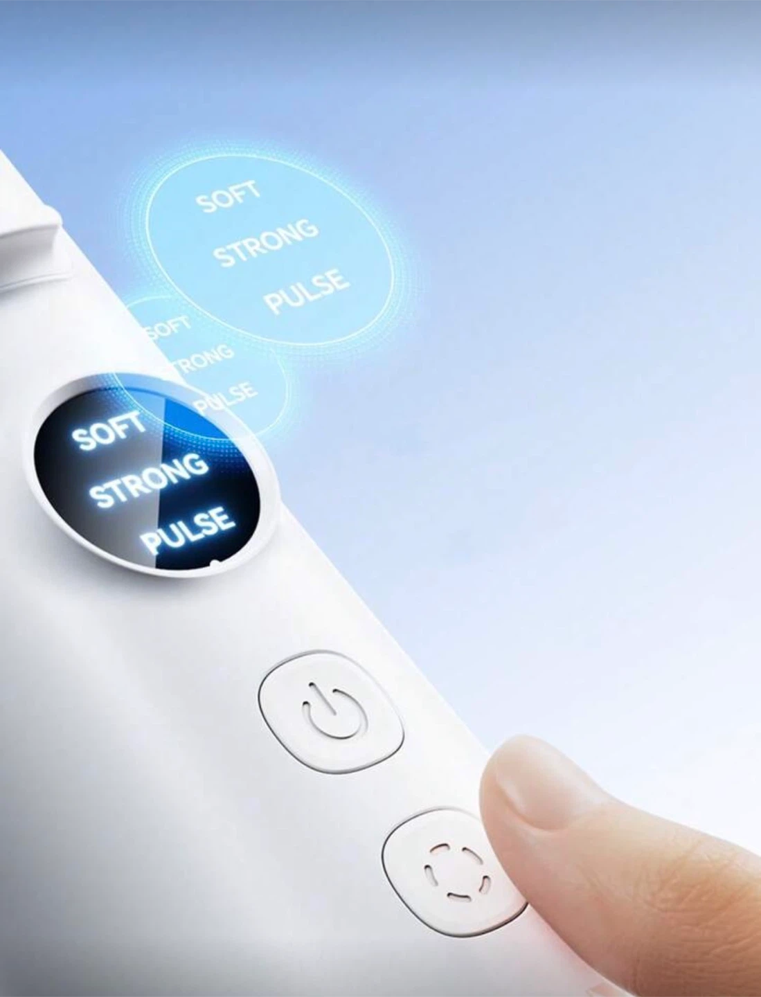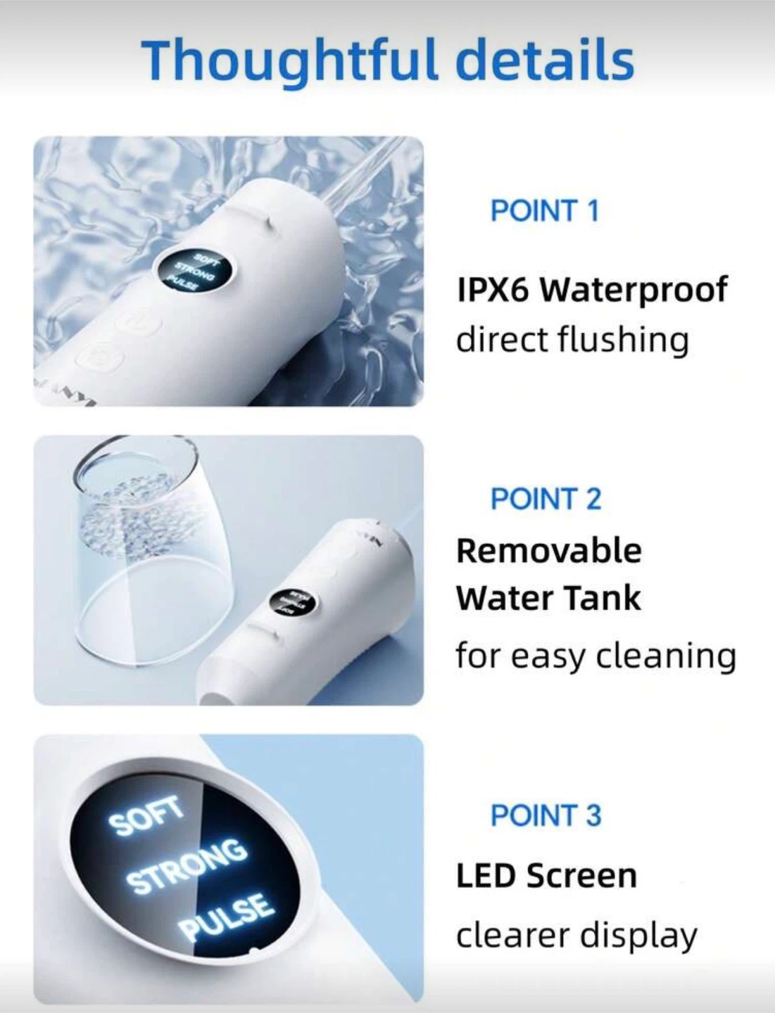 This is a portable water flosser with three modes: soft, strong, and pulse. It includes multiple flosser tips and a charging cable. Great for an easy way to clean your teeth!