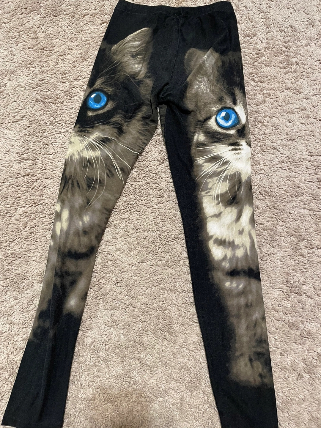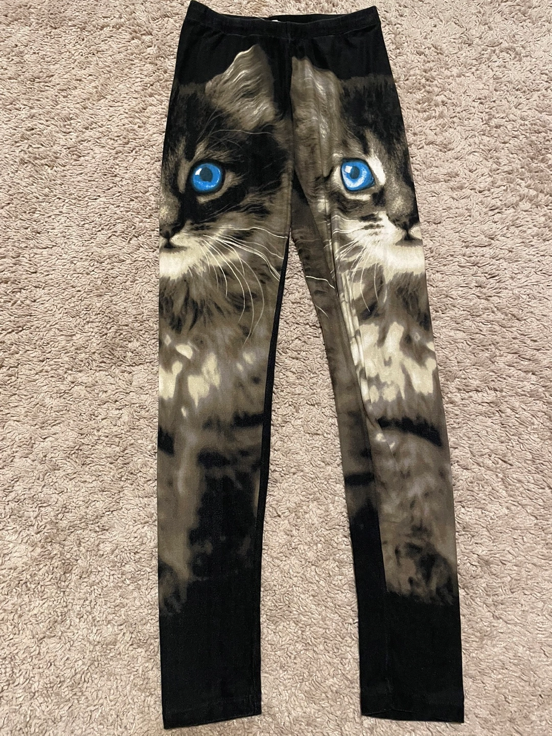 Cute cat leggings. Black background. Features a kitten's face. Very soft material. Great for lounging or casual wear.