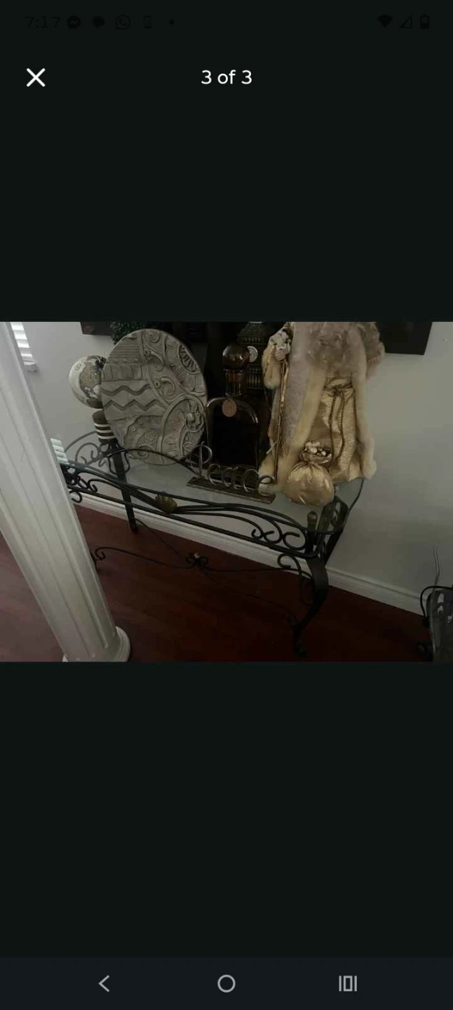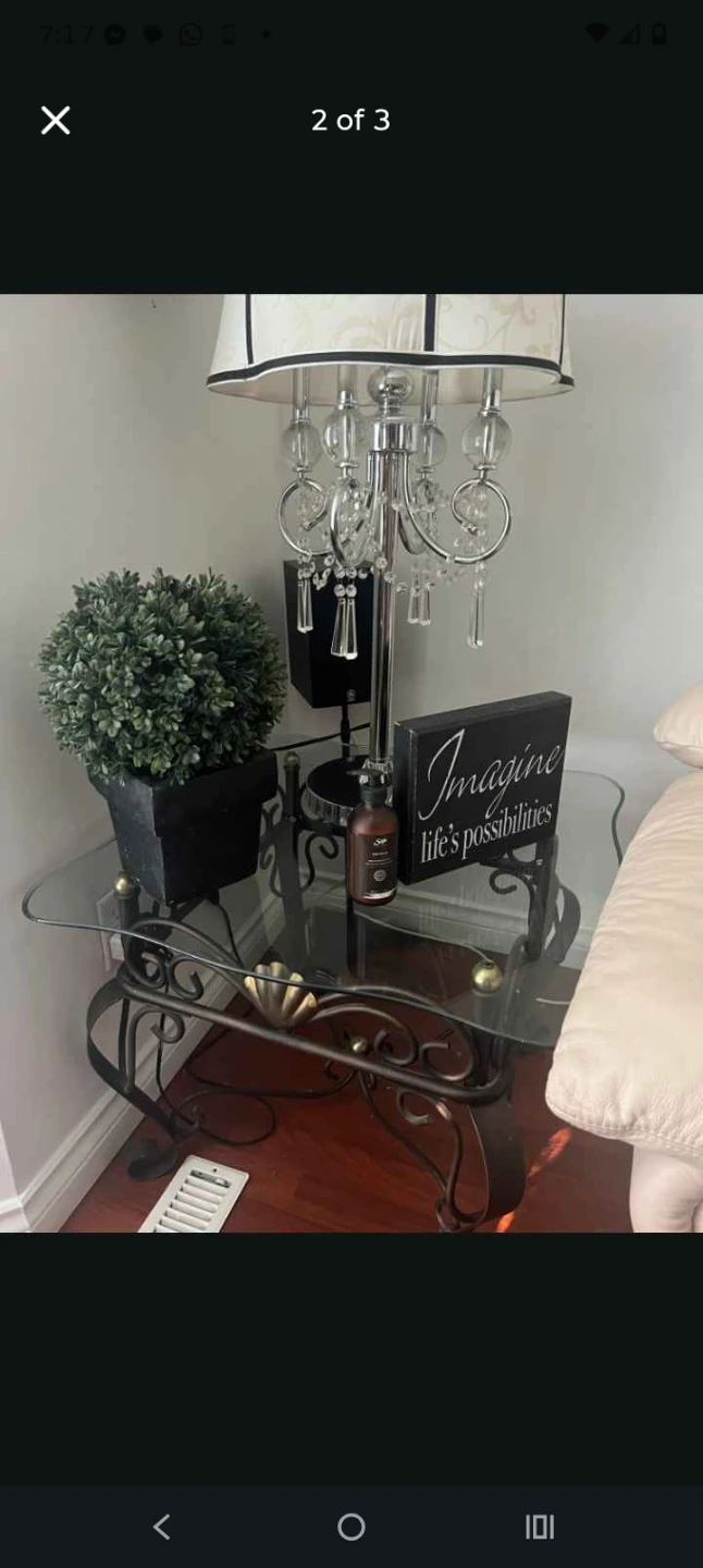 A beautiful accent table with a clear glass top and ornate metal scrollwork base. It's perfect for adding a decorative touch to any room. The table has a compact size suitable for placing next to a sofa or chair.