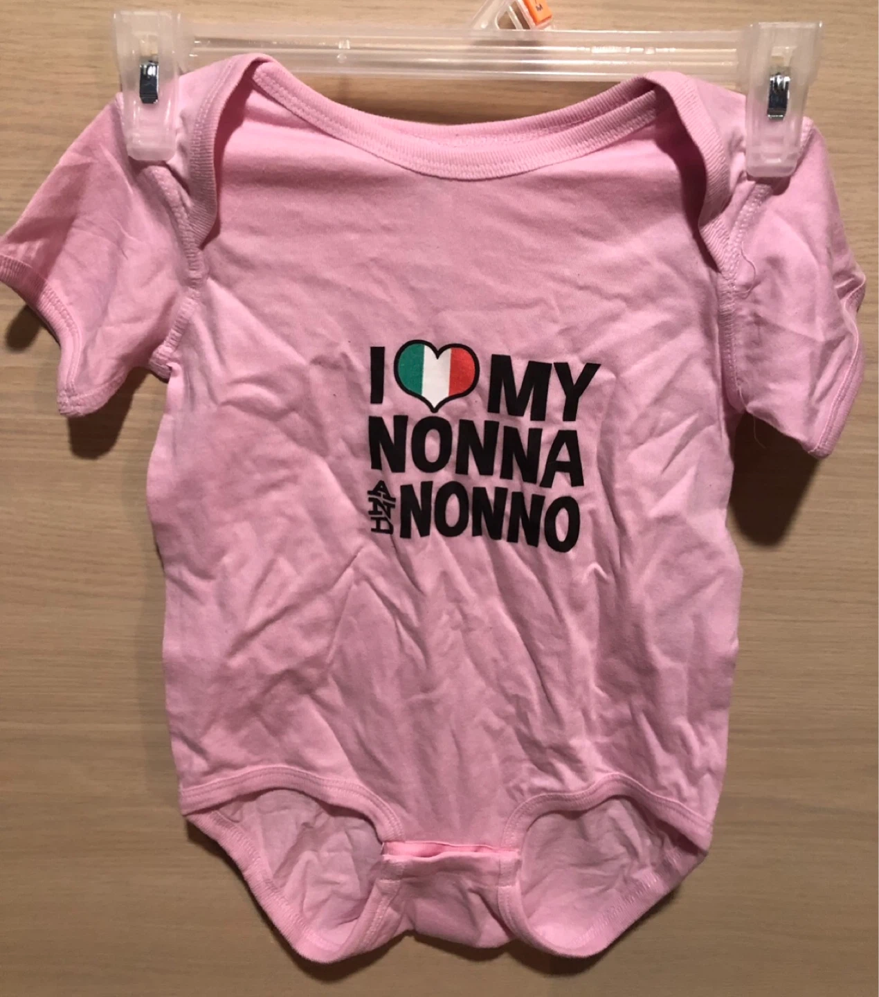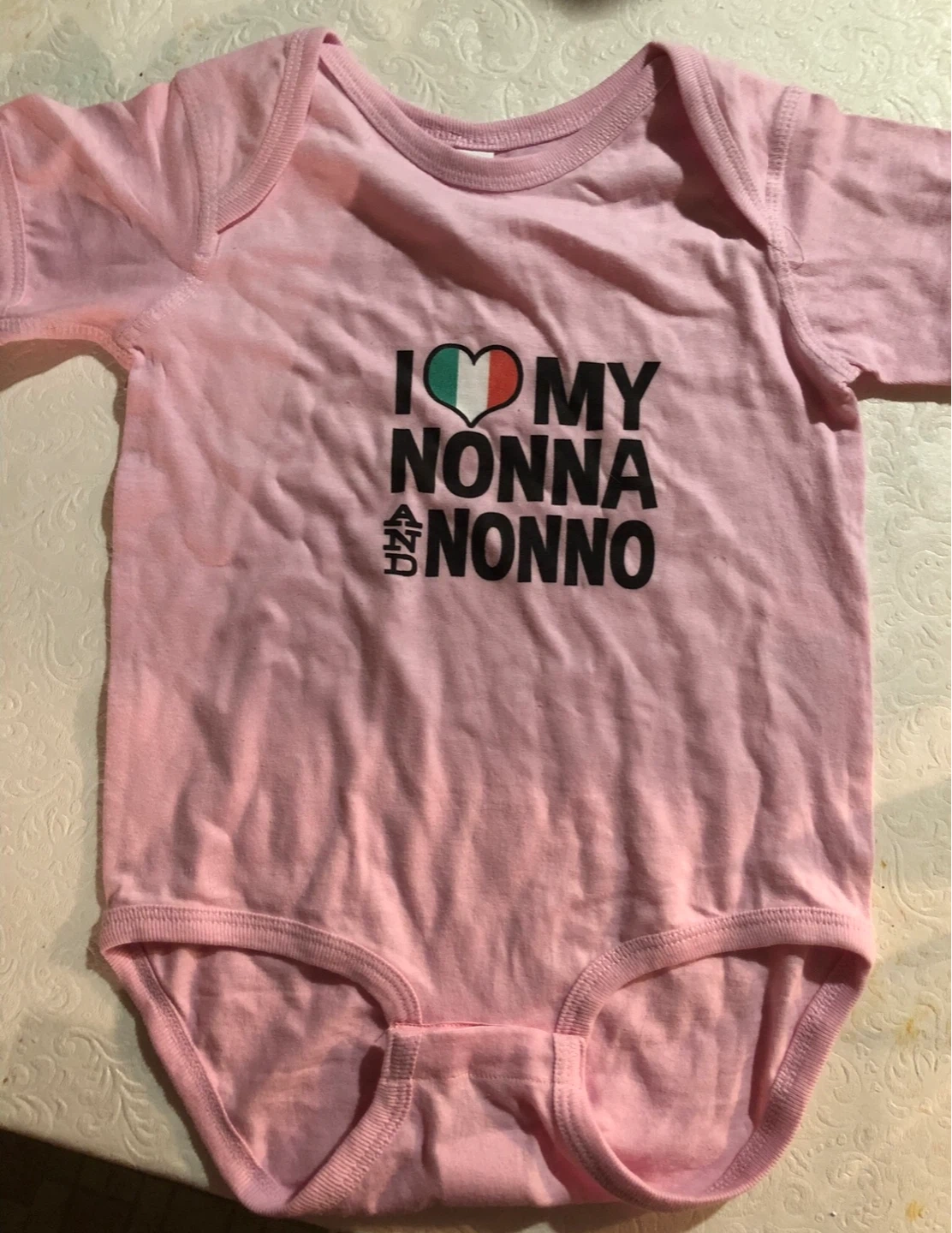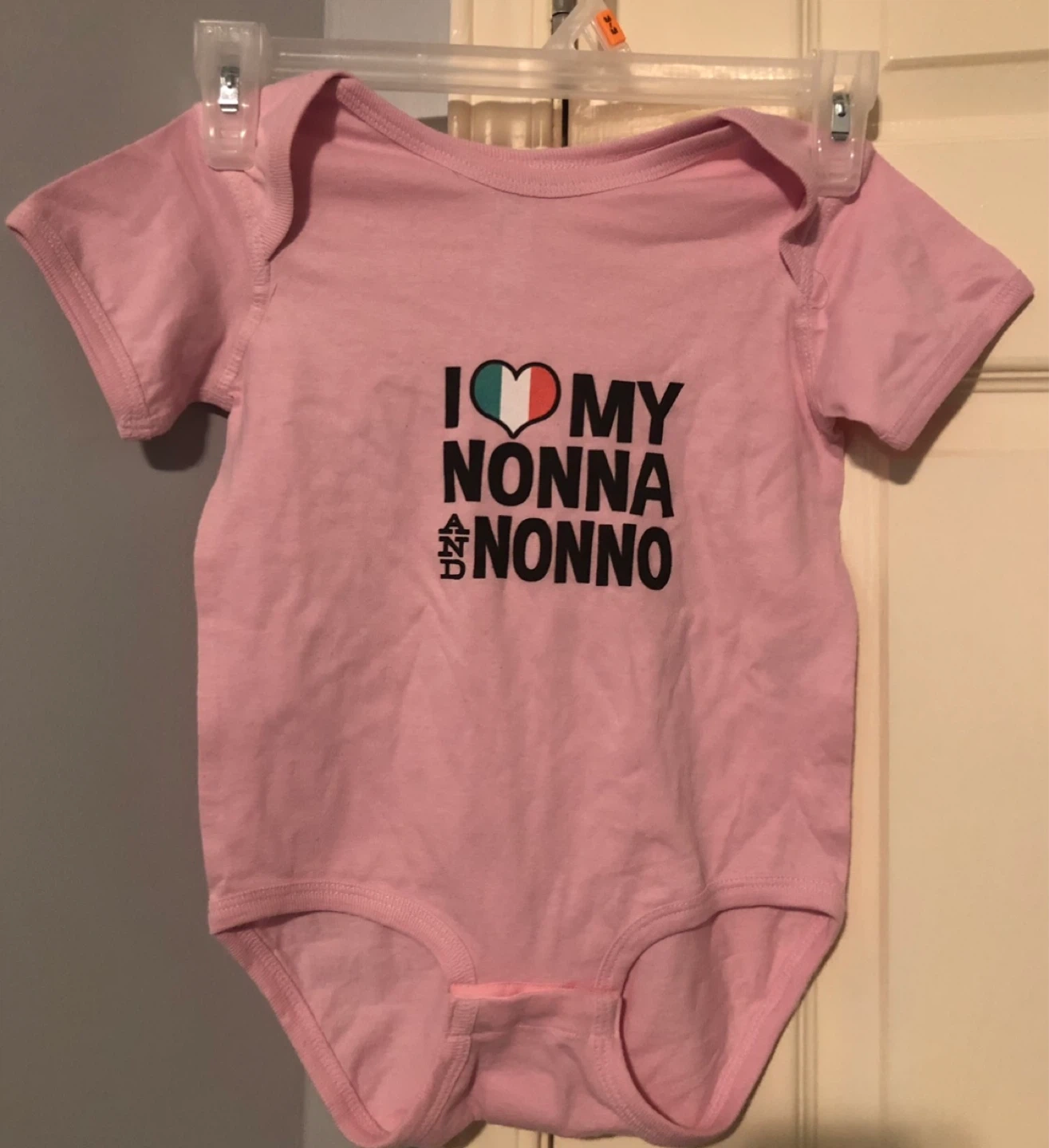 This pink bodysuit features a "I Love My Nonna and Nonno" graphic with an Italian flag heart. It's size 24 months. The material is soft cotton. It's a sweet gift for grandparents!