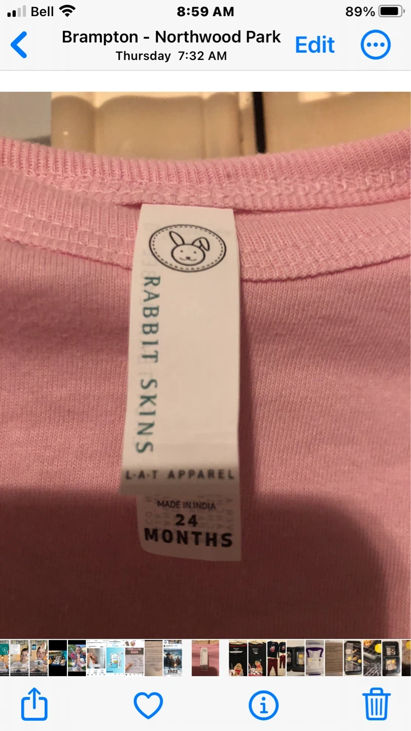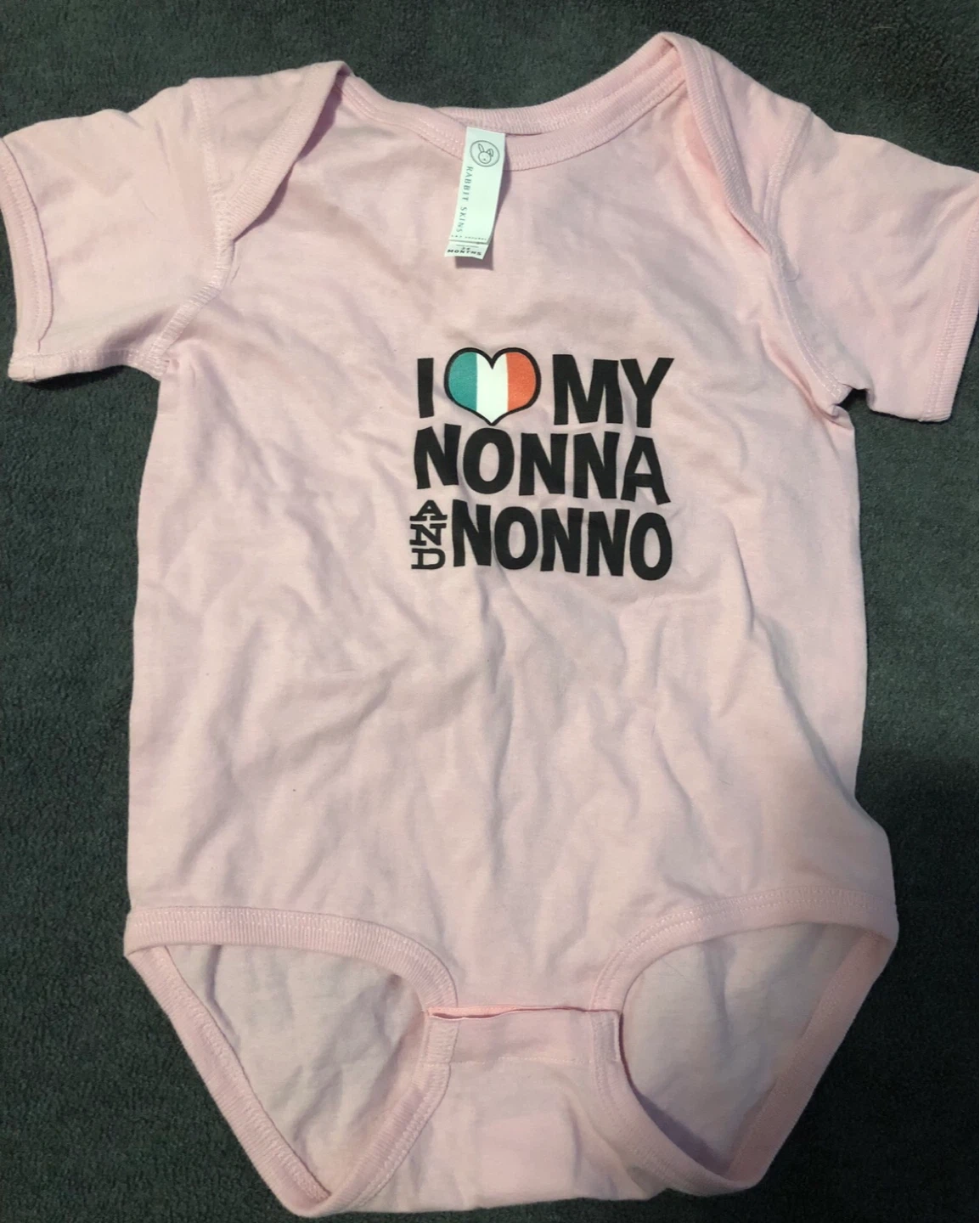 This pink bodysuit features a "I Love My Nonna and Nonno" graphic with an Italian flag heart. It's size 24 months. The material is soft cotton. It's a sweet gift for grandparents!