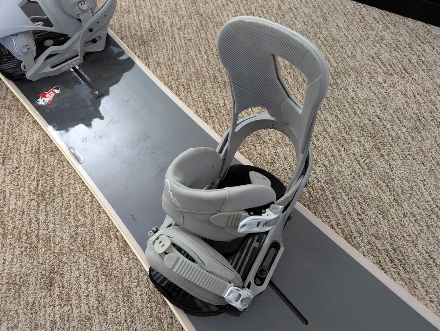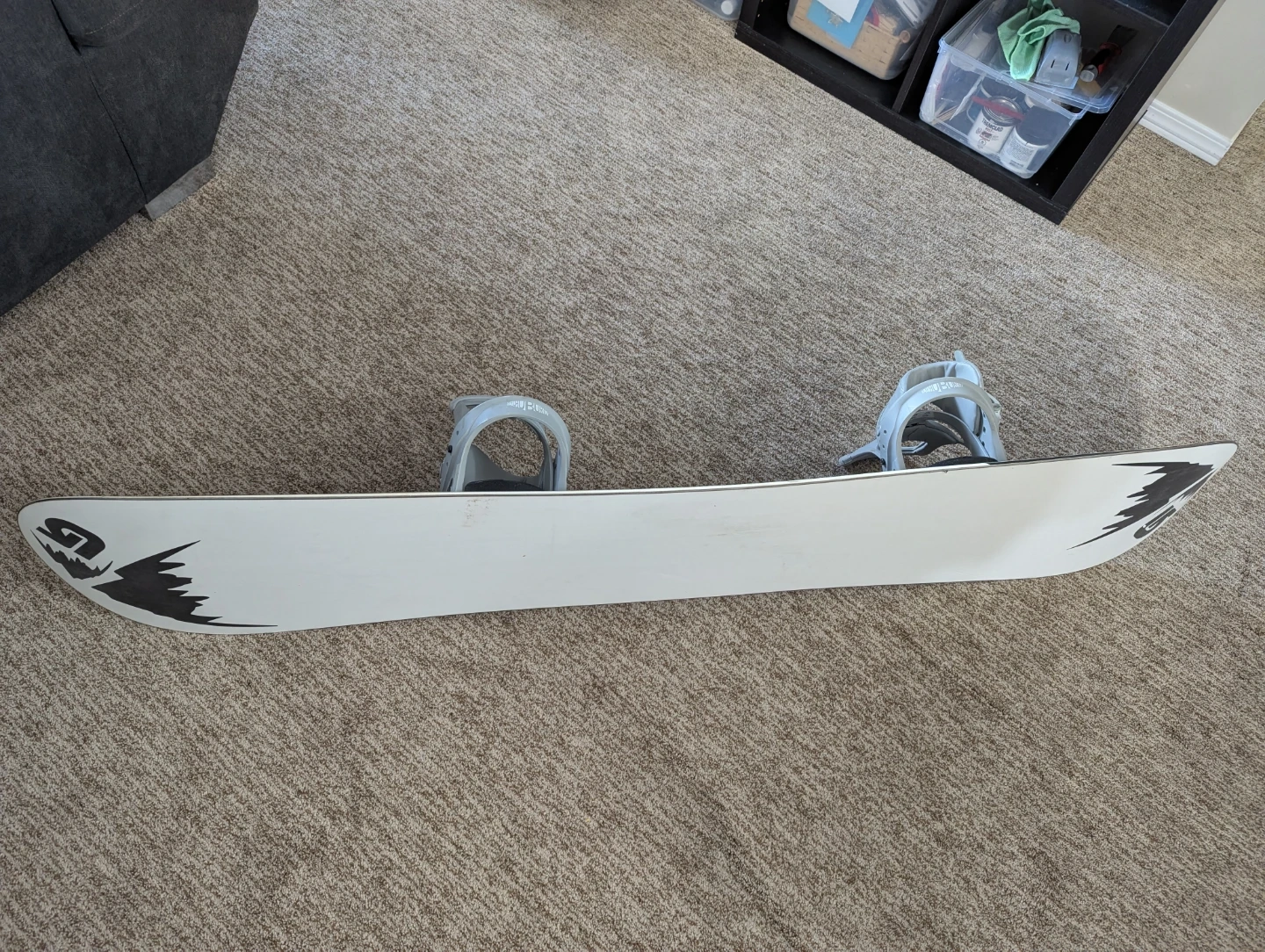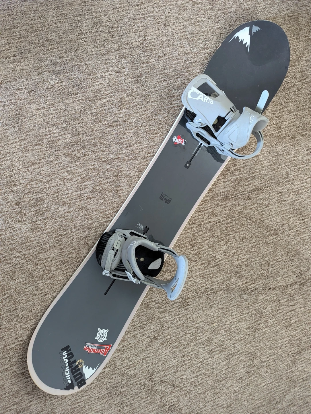 This is a Burton snowboard paired with Cartel bindings. The snowboard is primarily white with black graphic accents. The bindings are grey and appear to be in good condition. It's ready for the slopes!