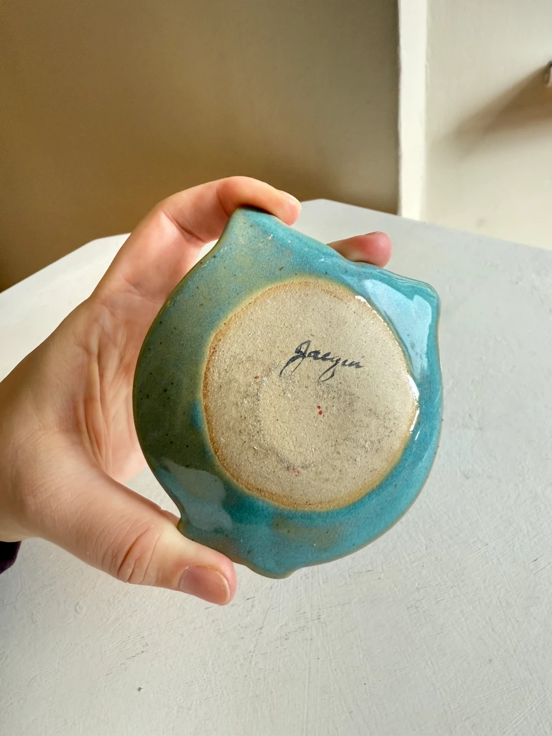 Handmade Owl ceramic pottery owl that can be used as a coin tray, trinket dish, jewelry tray…. whatever you can imagine! Has the maker mark “Jacqui” stamped into the bottom.