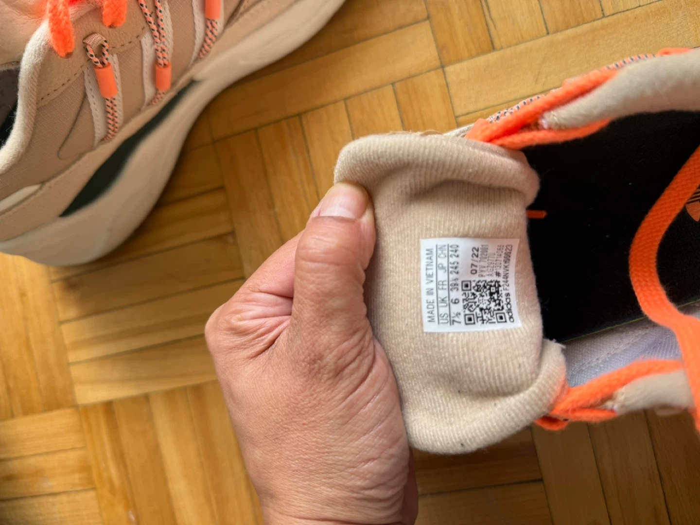 Selling a pair of Adidas ZX 2K Flux sneakers. They are a beige colour with bright orange laces. The size is US 7.5, UK 6, FR 39 1/3, JP 245, CHN 240. They are in good condition and ready for a new home!