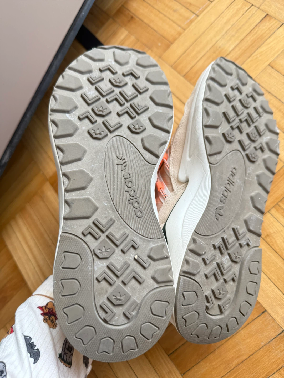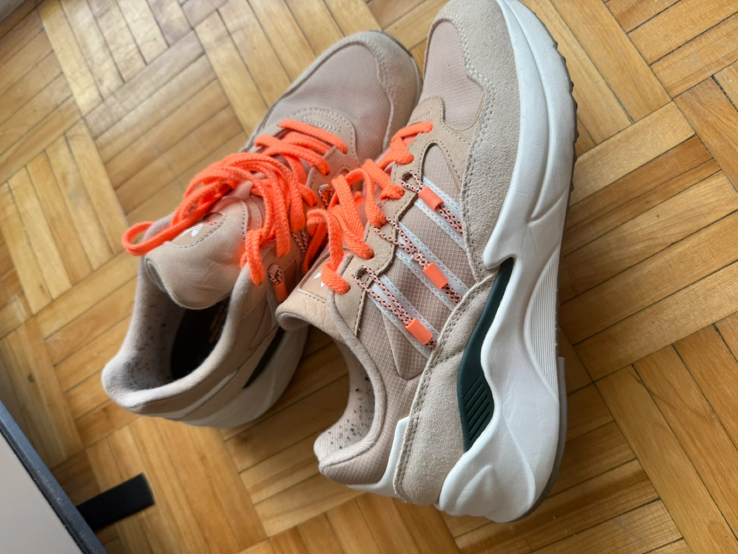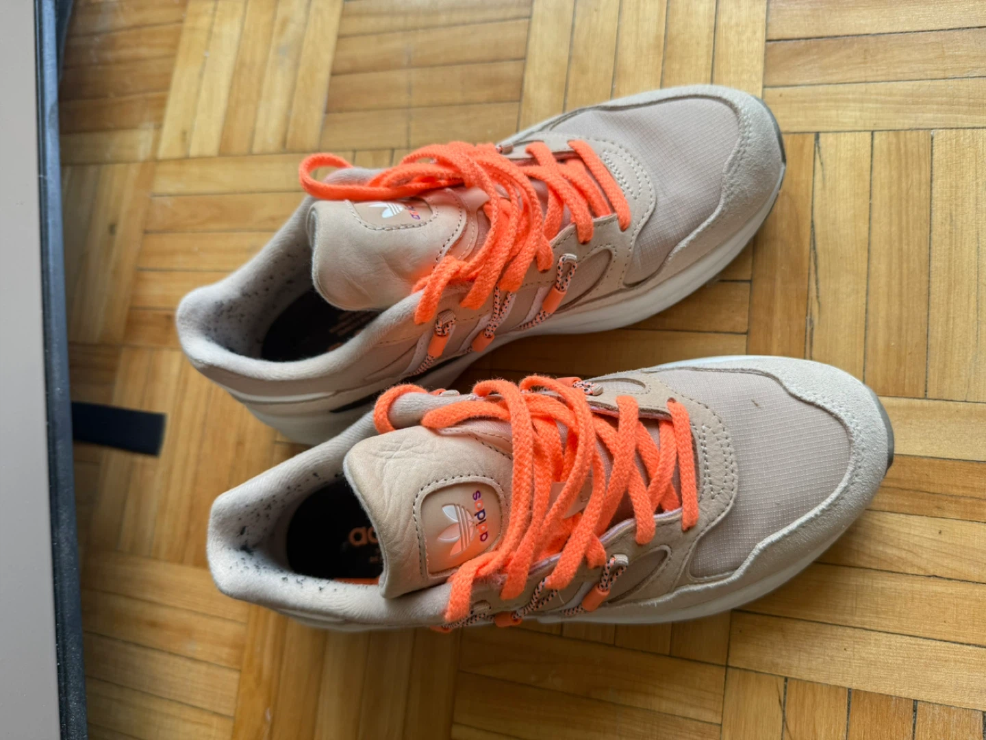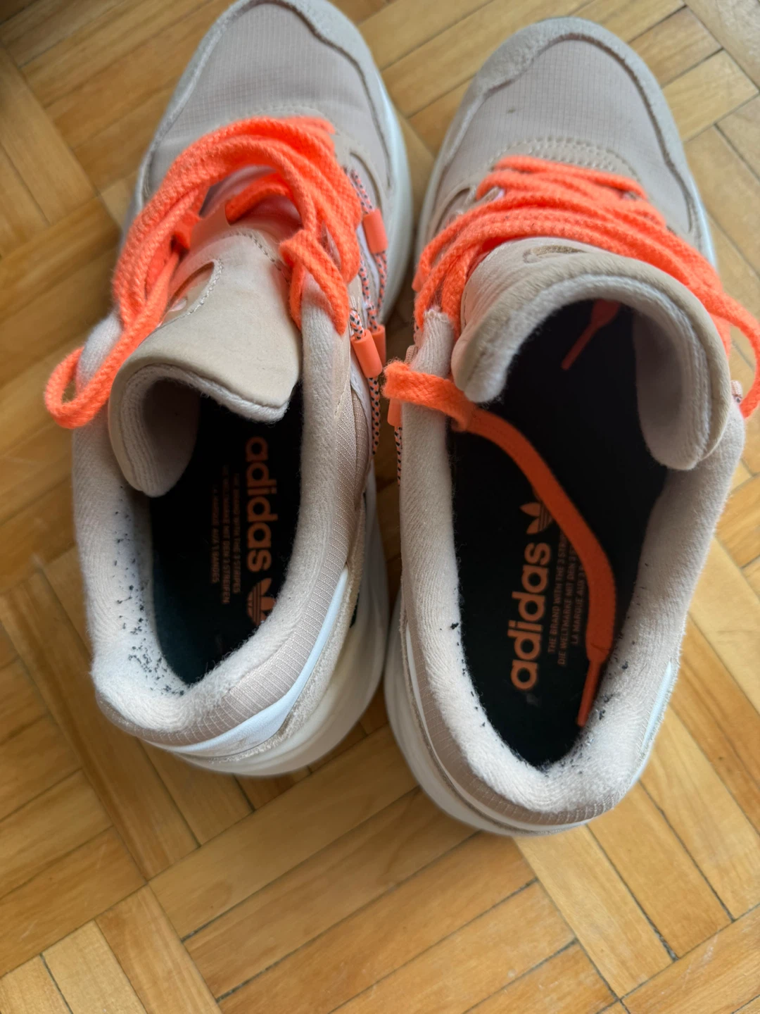 Selling a pair of Adidas ZX 2K Flux sneakers. They are a beige colour with bright orange laces. The size is US 7.5, UK 6, FR 39 1/3, JP 245, CHN 240. They are in good condition and ready for a new home!