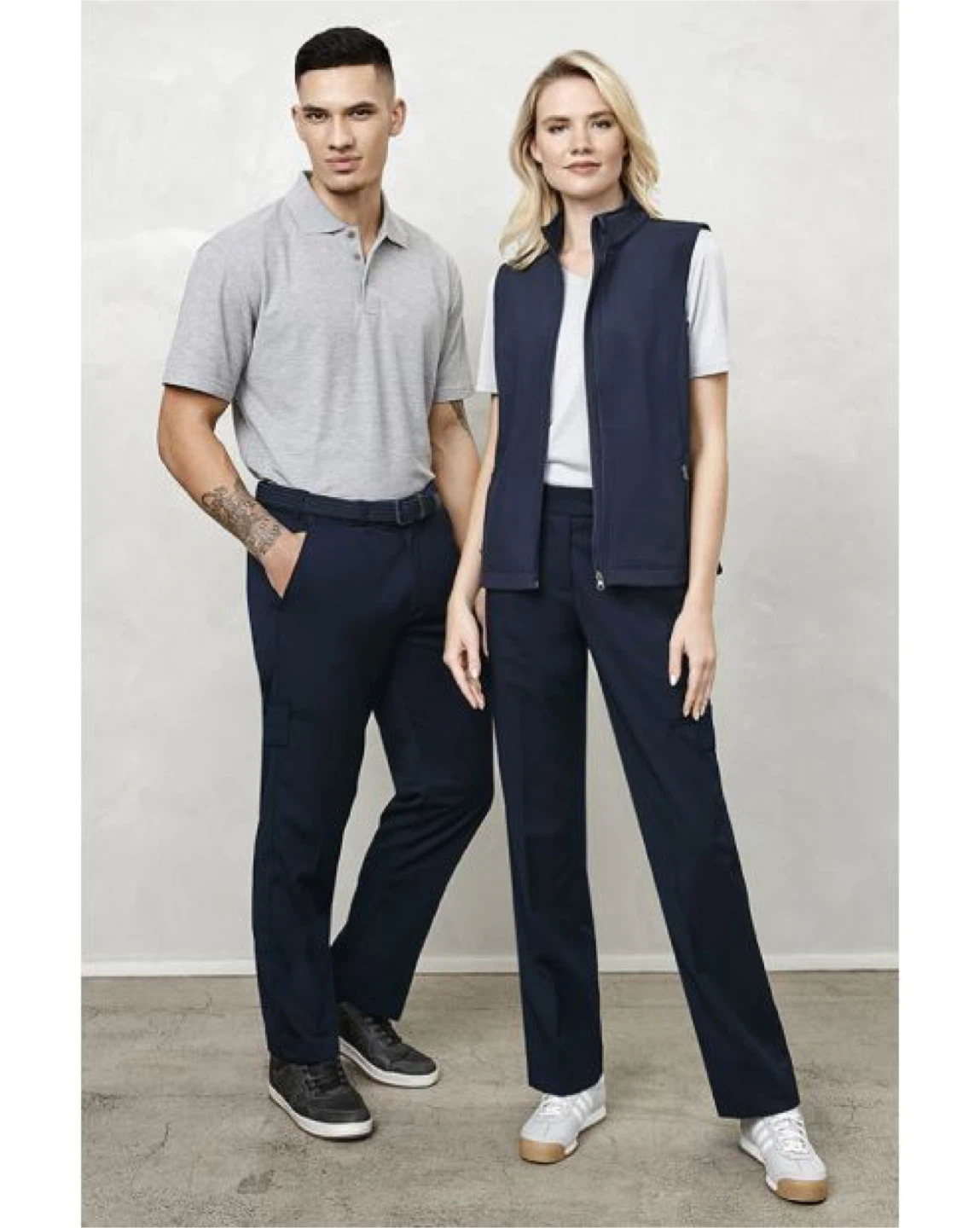 Flat front with side pockets, 2 rear pockets and 2 modern styled leg pockets for storage