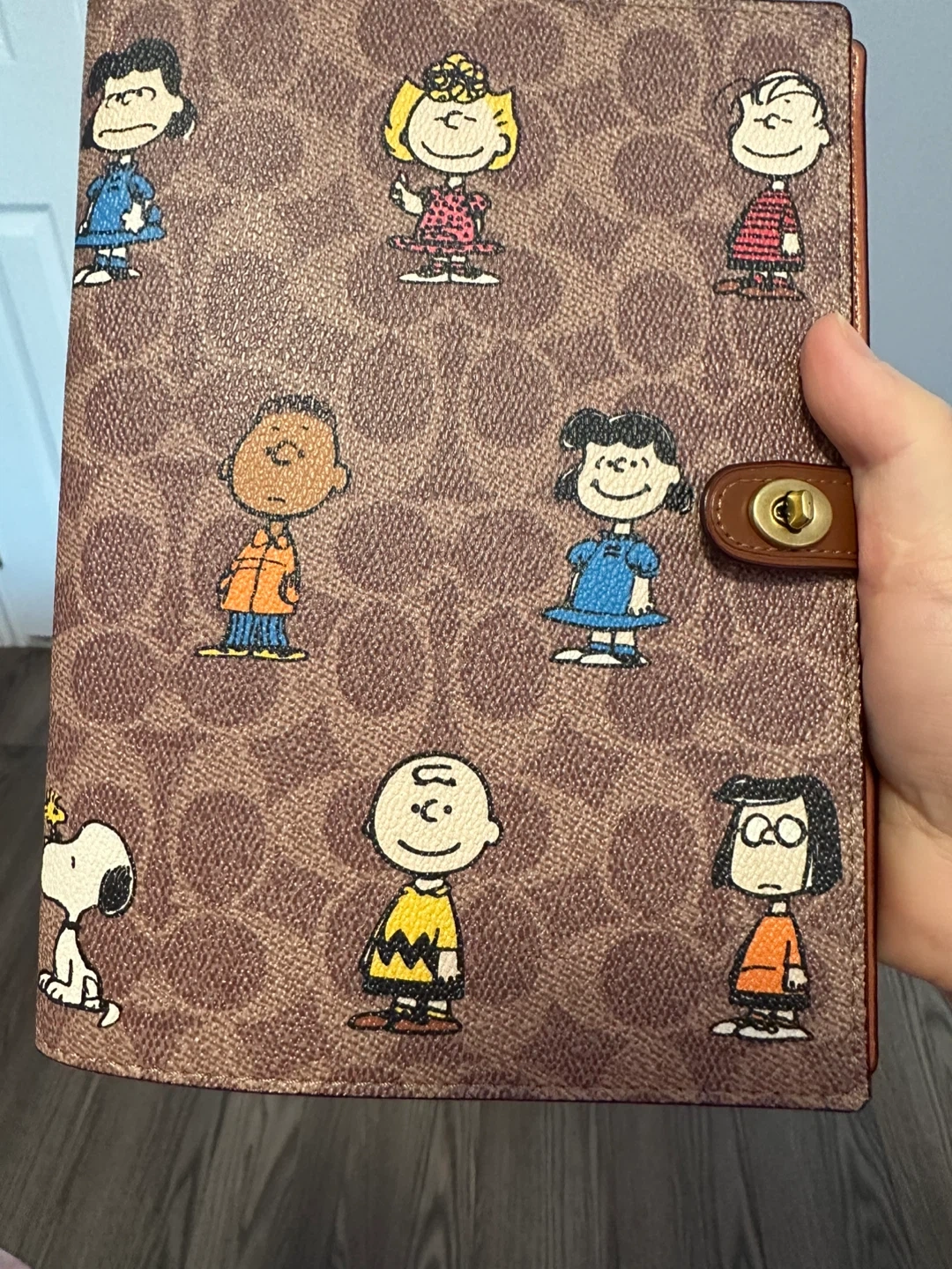 This Coach folio features a classic brown signature C pattern with a fun Peanuts character print. It's got a secure snap closure and looks like it's designed to hold papers or a small notebook. Perfect for fans of Snoopy and the gang!