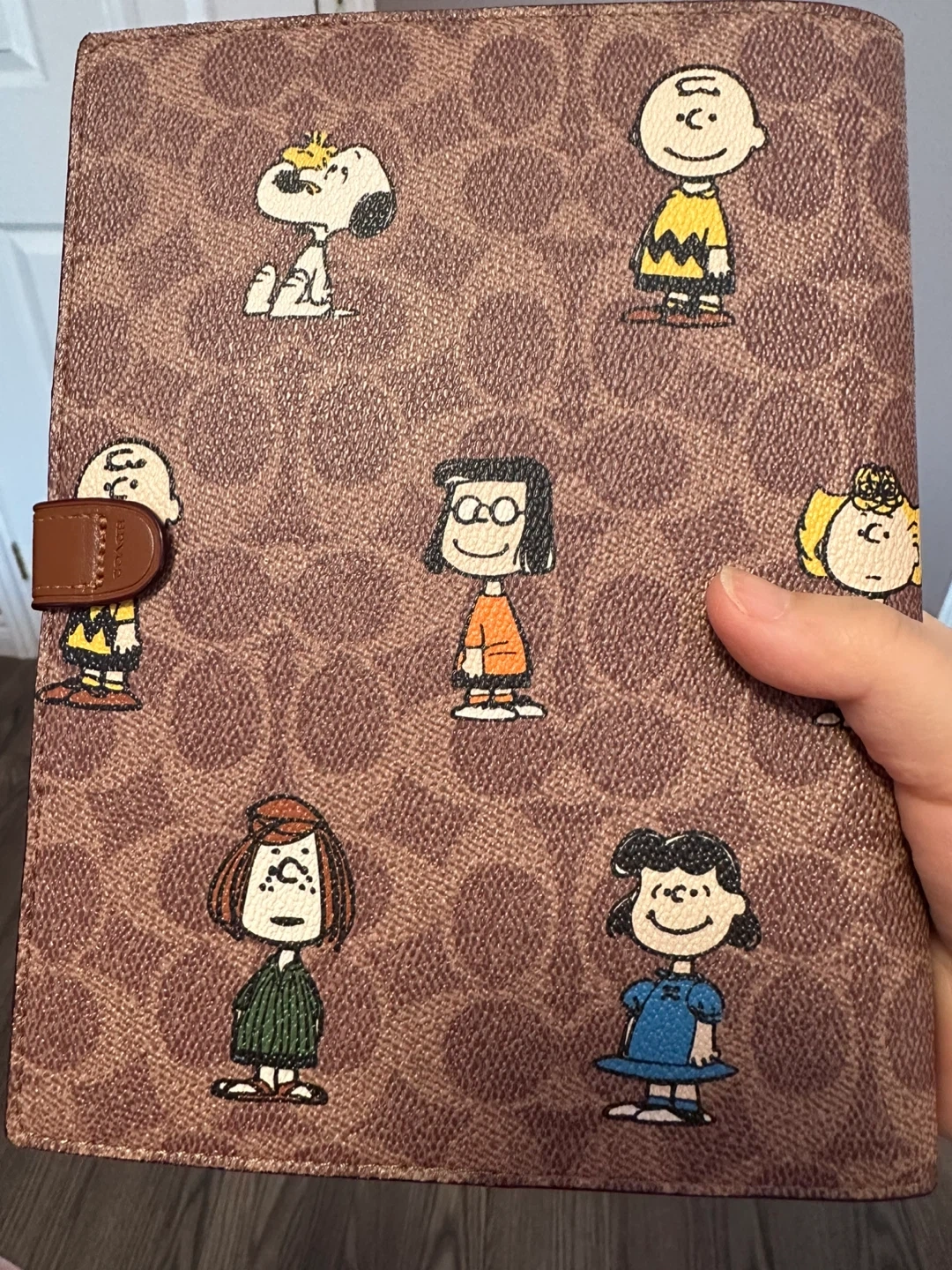 This Coach folio features a classic brown signature C pattern with a fun Peanuts character print. It's got a secure snap closure and looks like it's designed to hold papers or a small notebook. Perfect for fans of Snoopy and the gang!