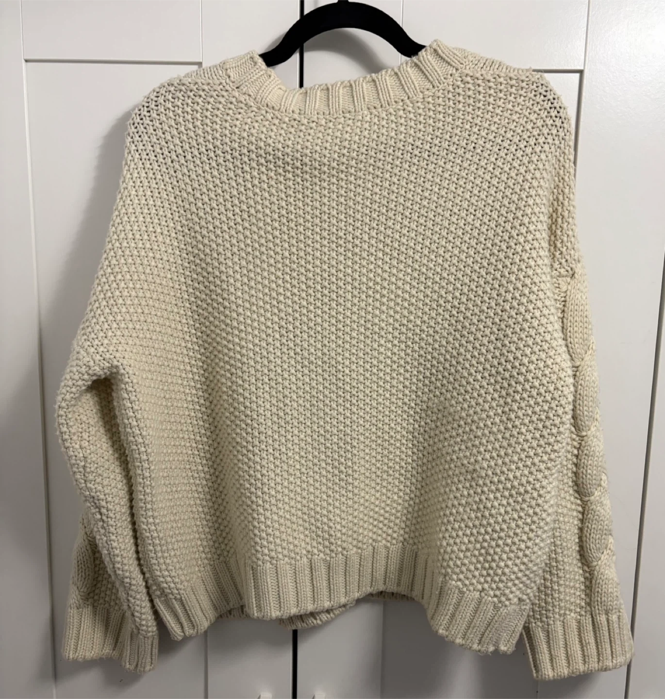 Cozy cream cable knit cardigan from Hackesch. It's size is M.