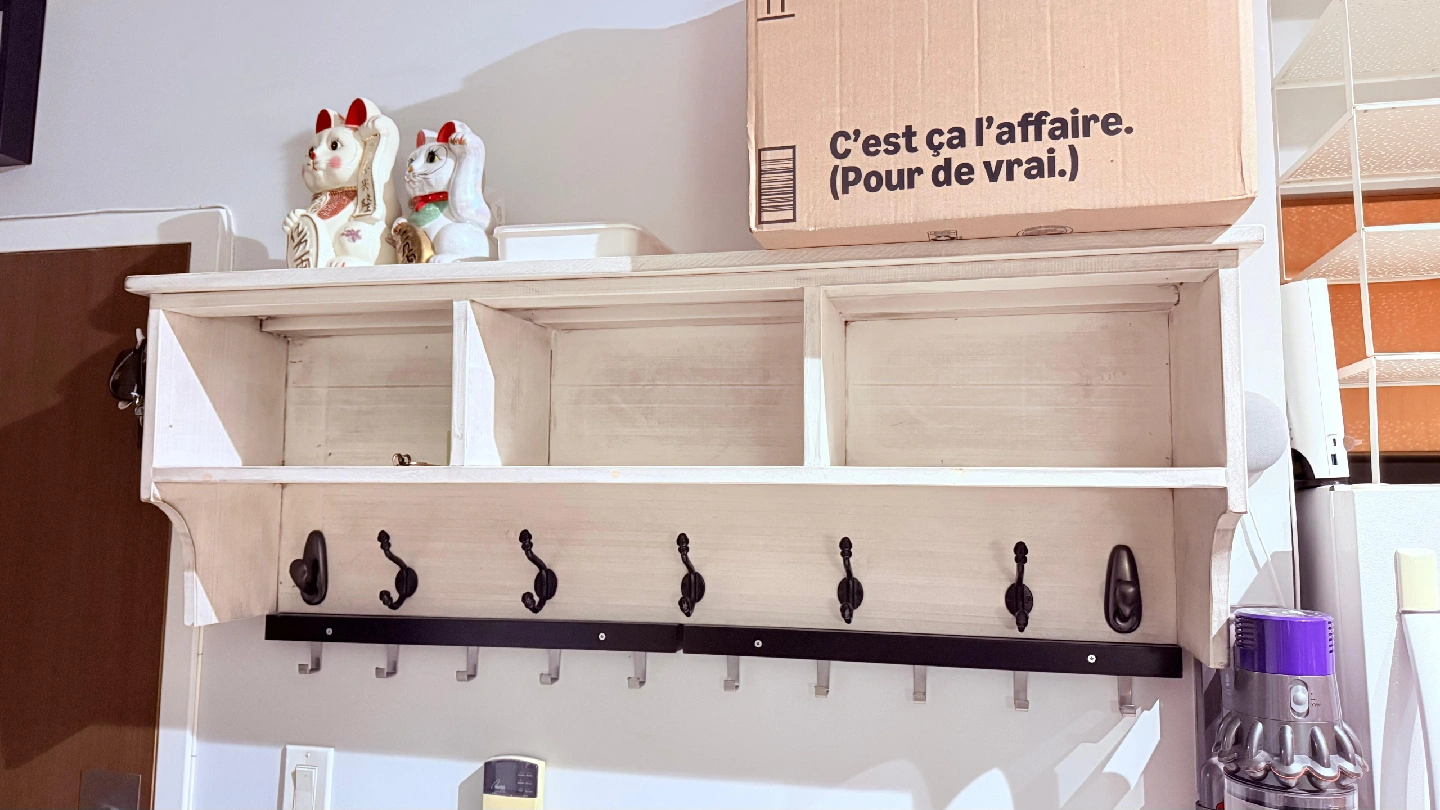 Like-new solid wood hutch with 5 large coat hooks and 3 cubbies, perfect for storing keys, small purses, sunglasses, wallets, etc. 48.5”Lx17”Hx10.25”D Comes with 2x IKEA TJUSIG mini coat hooks. Must pick up from downtown yourself (across Rogers Center) before end of October. If ad is up, item is available.