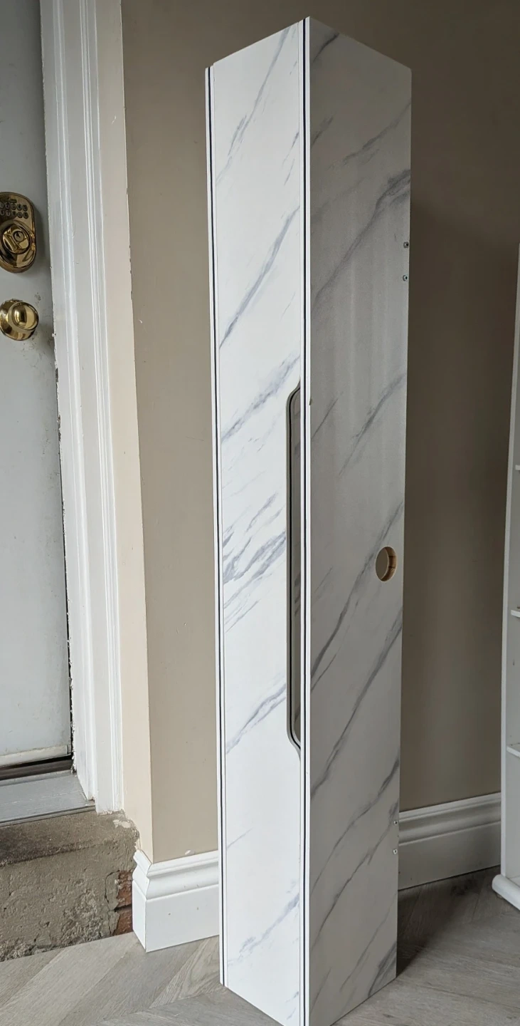 This narrow storage cabinet features a white marble print finish with a modern handle with soft clothes feature. Floating shelf for entertainment systems.