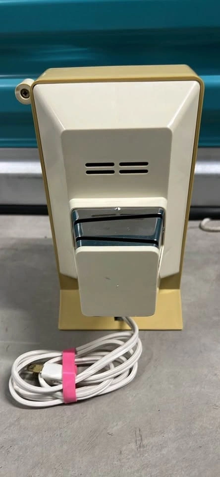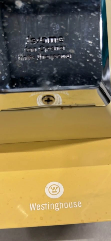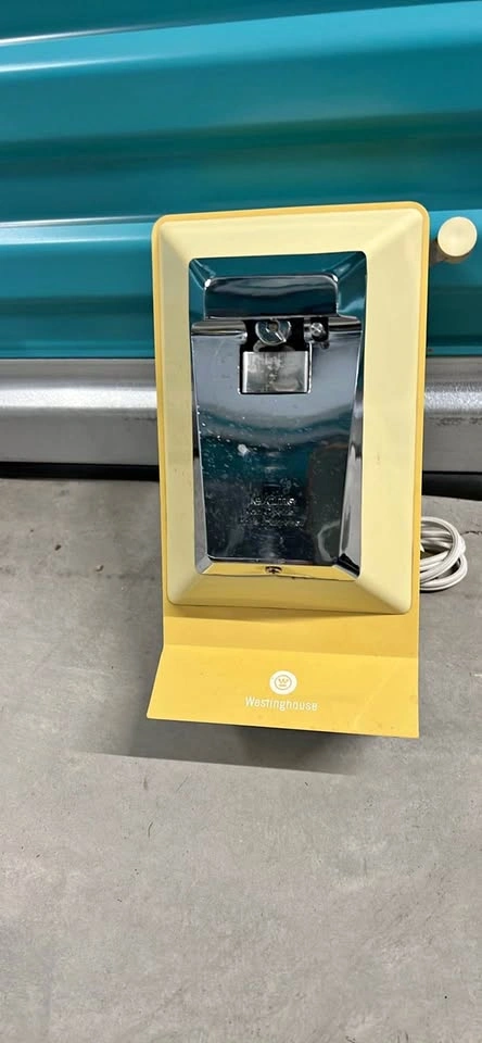 Collector-quality vintage Westinghouse Canopy in iconic 1970s Harvest Yellow. This unit is in pristine, "time capsule" condition with a mirror-finish chrome faceplate and a spotless housing. It’s a versatile 3-in-1 piece featuring a powerful electric can opener, a built-in knife sharpener on the reverse, and an integrated bottle opener. The mechanical components are exceptionally clean, including the magnetic lid lifter and the original cord. This is a high-asset item for a period-correct kitchen restoration or a professional film/TV production set looking for a "mint" 70s aesthetic.