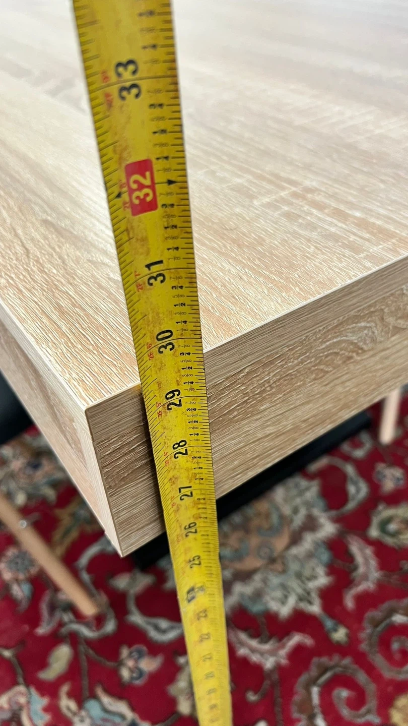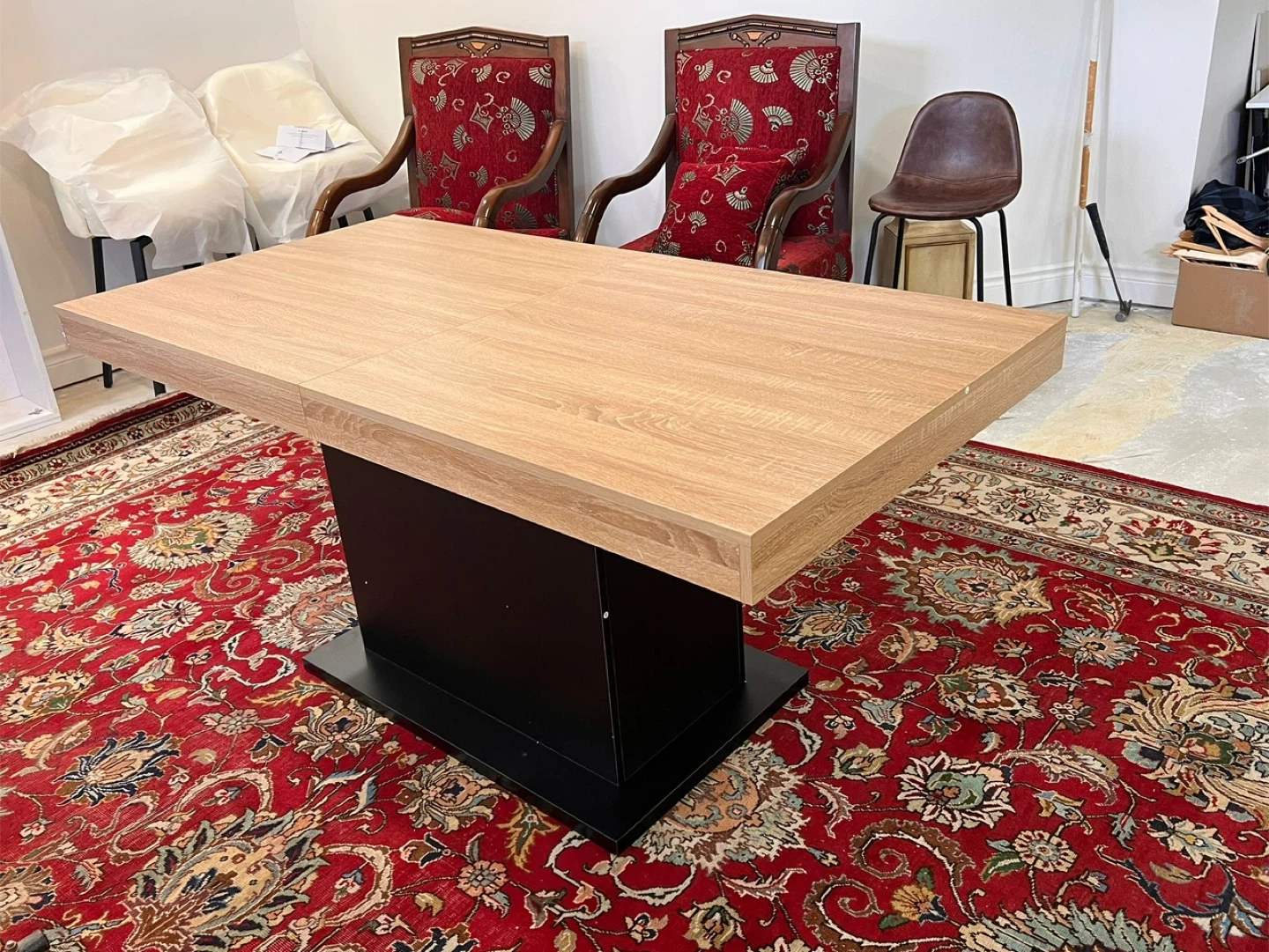 This is a dining table with a wood grain finish. It's designed with a modern, clean aesthetic. The surface is durable and easy to clean.