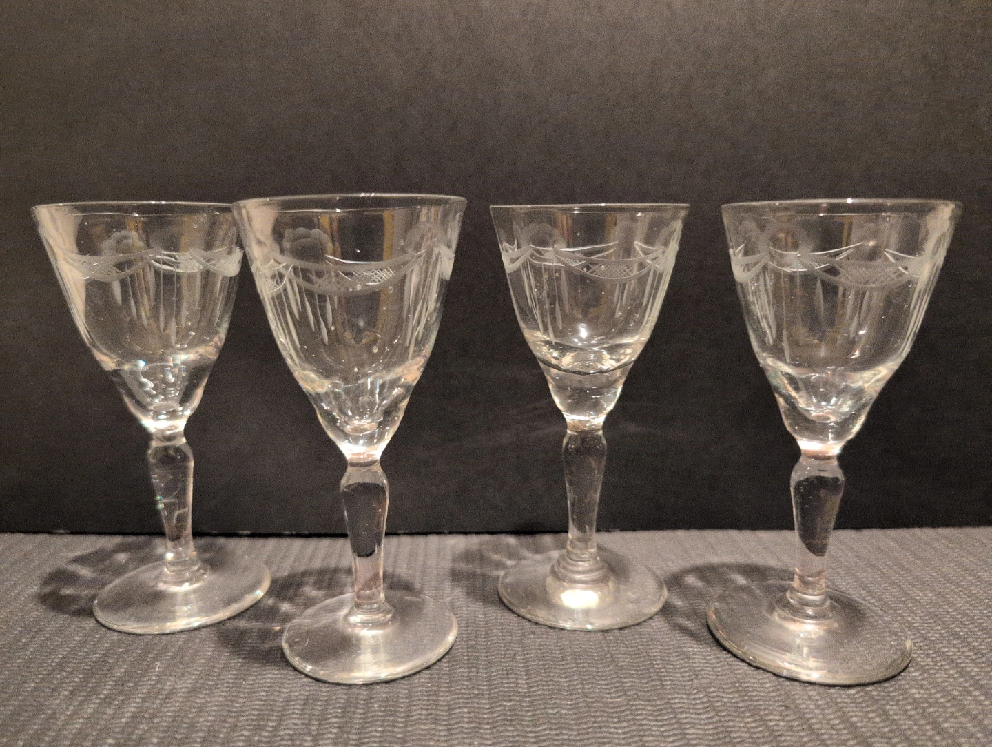 Set of 4 Etched Glass Vintage Cordial Glasses