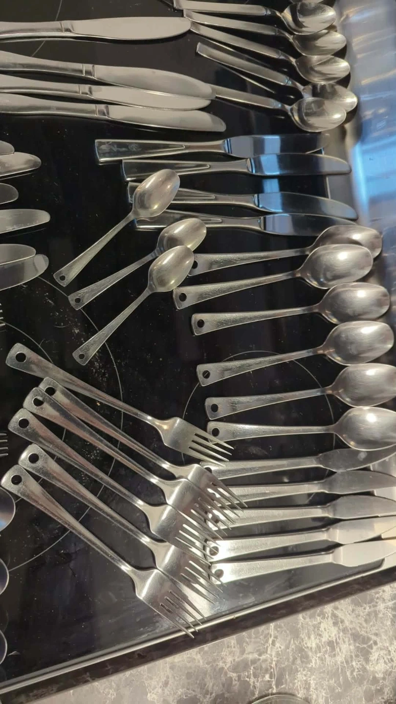 22 butter knives, 14 dinner spoons, 14 dinner forks, six dessert forks, three mini spoons, 10 dessert spoons