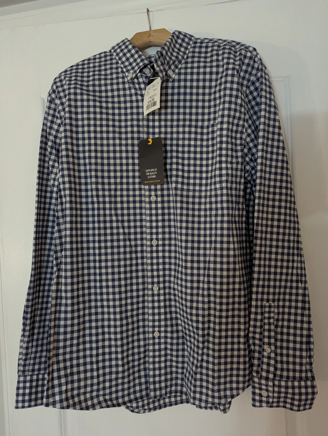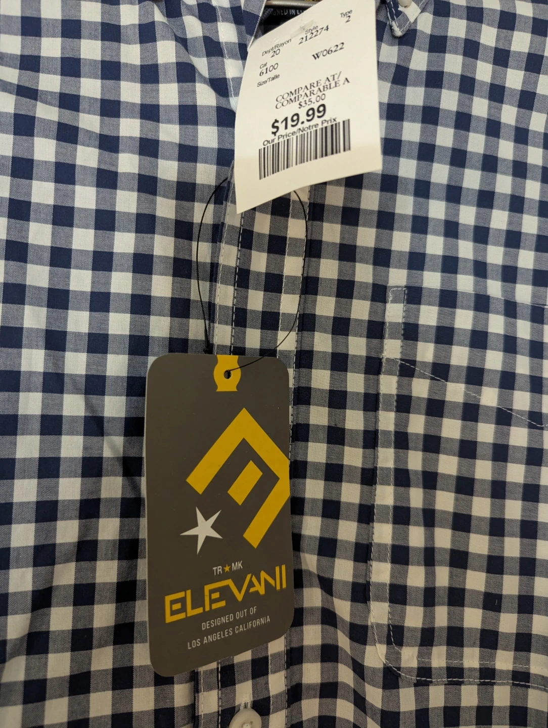 This Elevaani button-up shirt features a classic navy and white gingham pattern. It's designed with a collared neckline and long sleeves. This shirt is a great choice for casual wear!