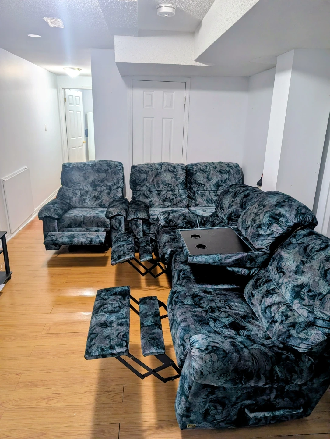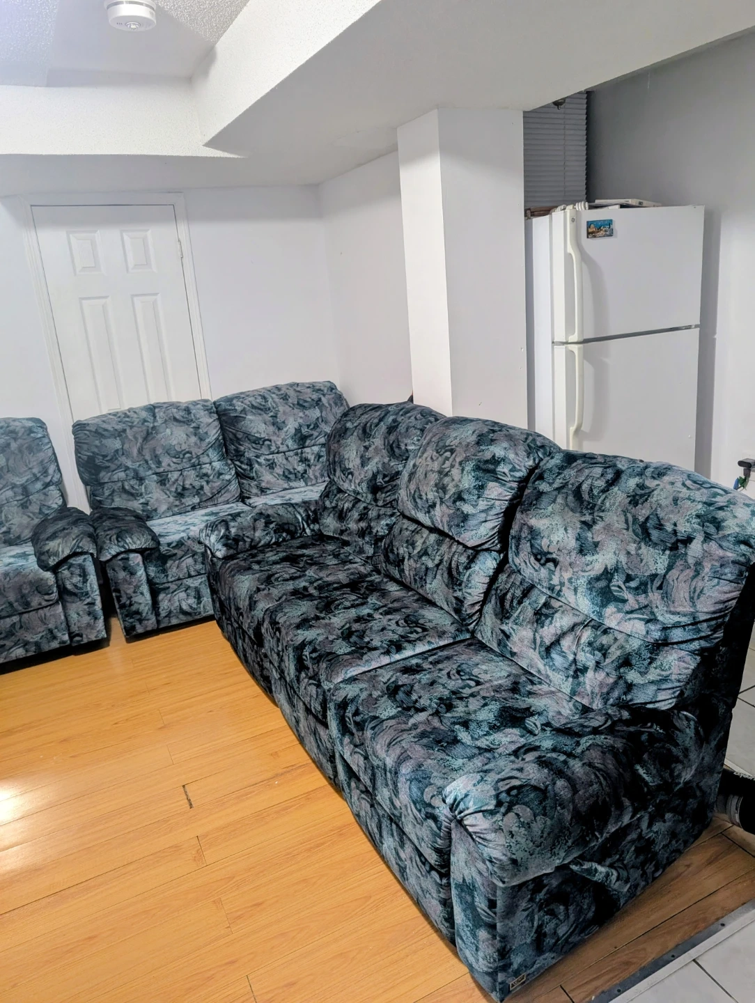 Selling a reclining sofa set that includes a loveseat, sofa, and chair. The set features a unique patterned design in shades of blue and grey. Perfect for a living room or entertainment space!