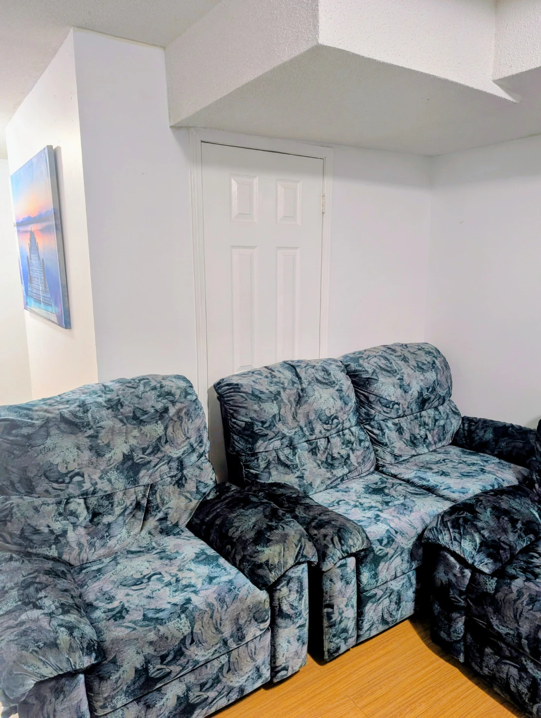 Selling a reclining sofa set that includes a loveseat, sofa, and chair. The set features a unique patterned design in shades of blue and grey. Perfect for a living room or entertainment space!