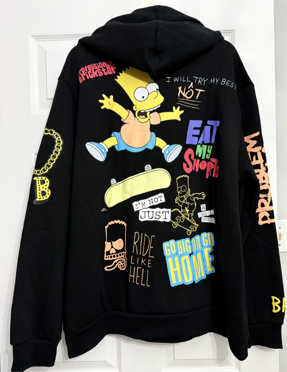 This black hooded sweatshirt features Bart Simpson graphics and text from The Simpsons. It's made of a comfortable fabric blend. A fun piece for any fan!