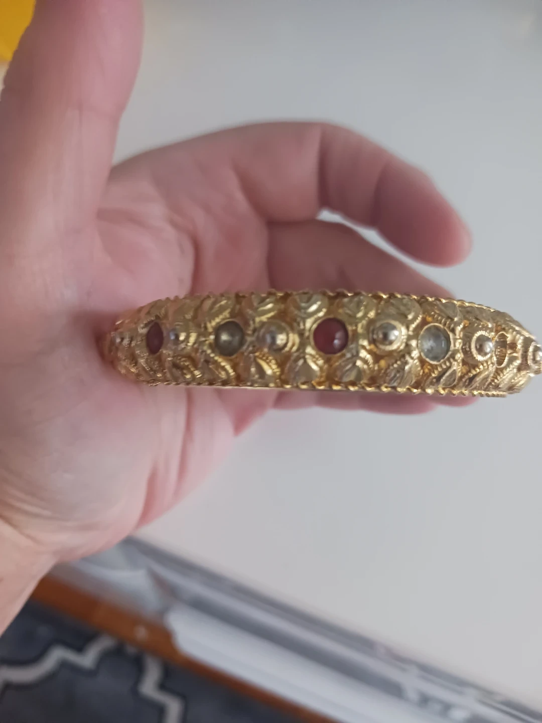 A beautiful gold-tone bangle adorned with small clear and red stones. It features an intricate embossed floral and leaf design all around. The bangle measures approximately 7 cm in diameter.